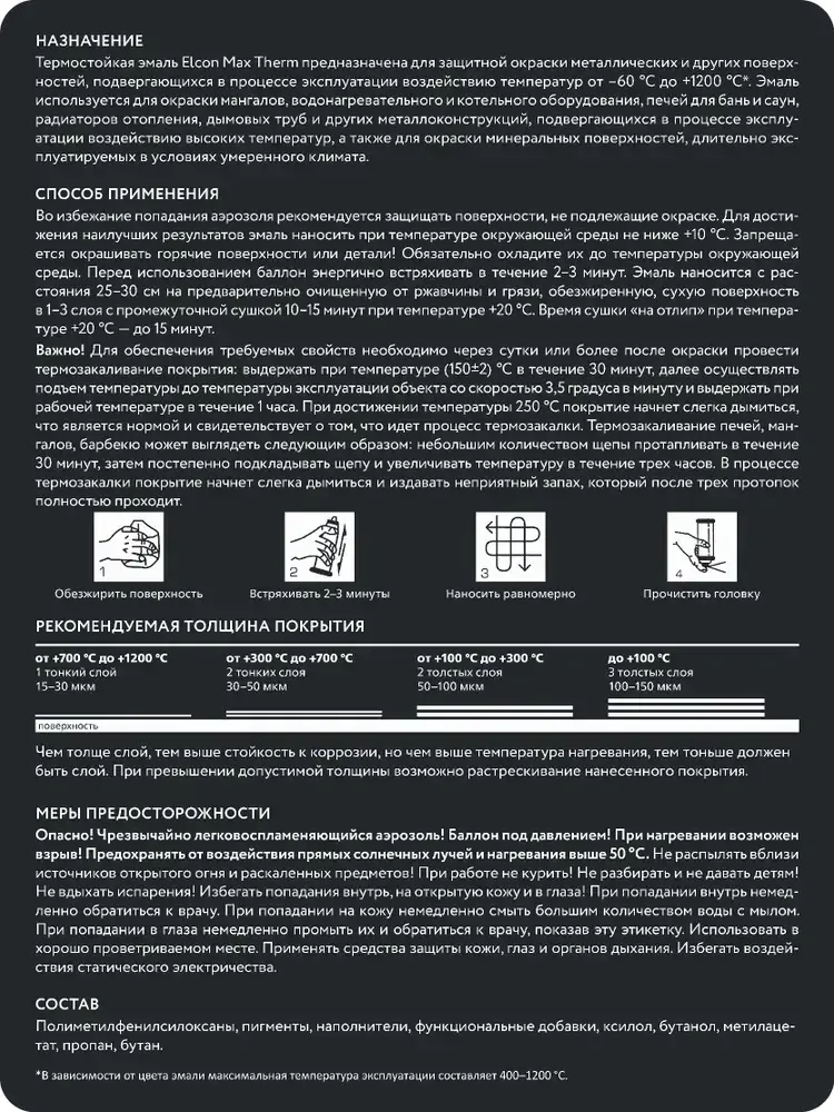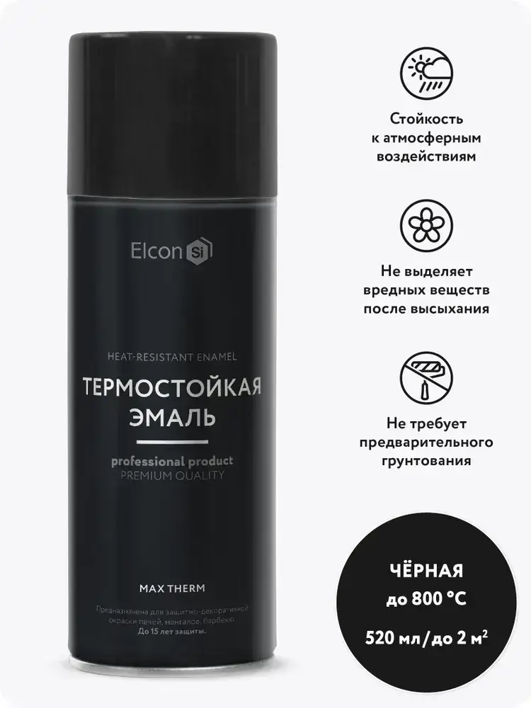 Аэрозольная краска Elcon Max Therm термостойкая до 800 градусов антикоррозионная для печей мангалов радиаторов матовое покрытие, аэрозоль 520 мл, черная
