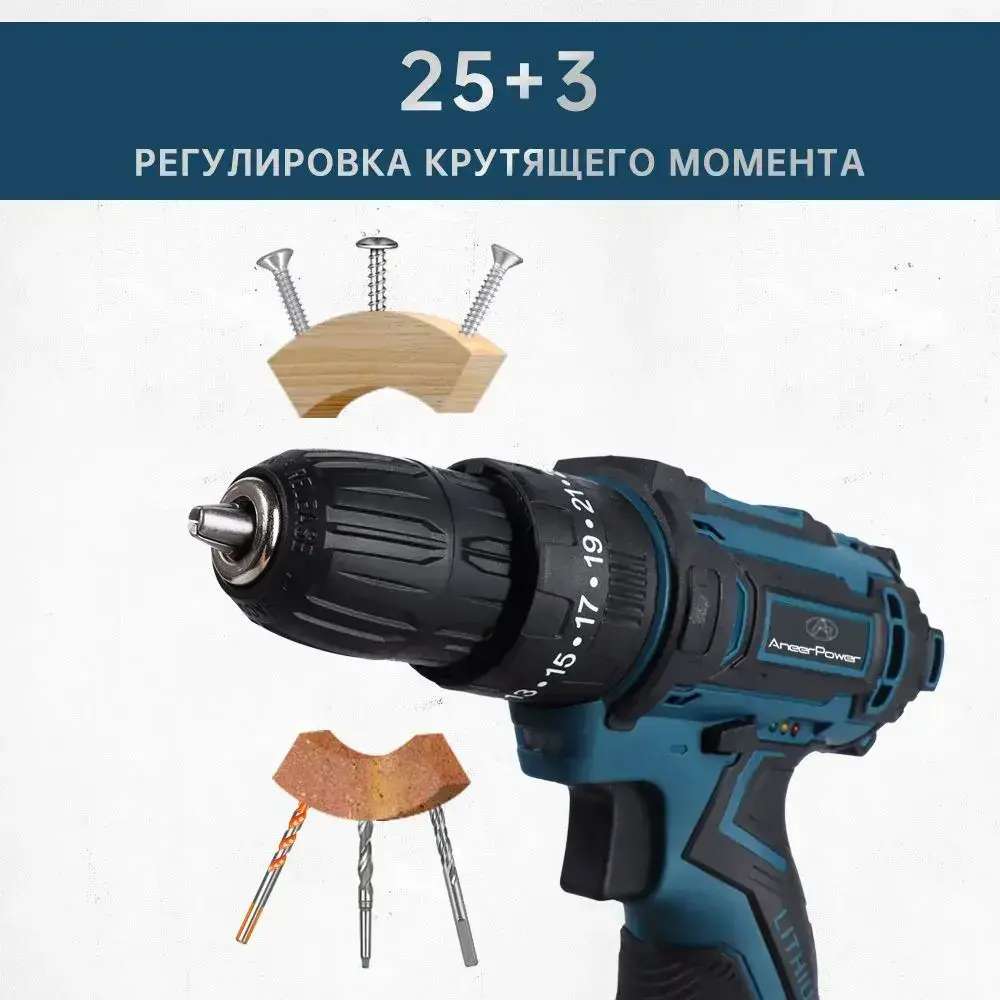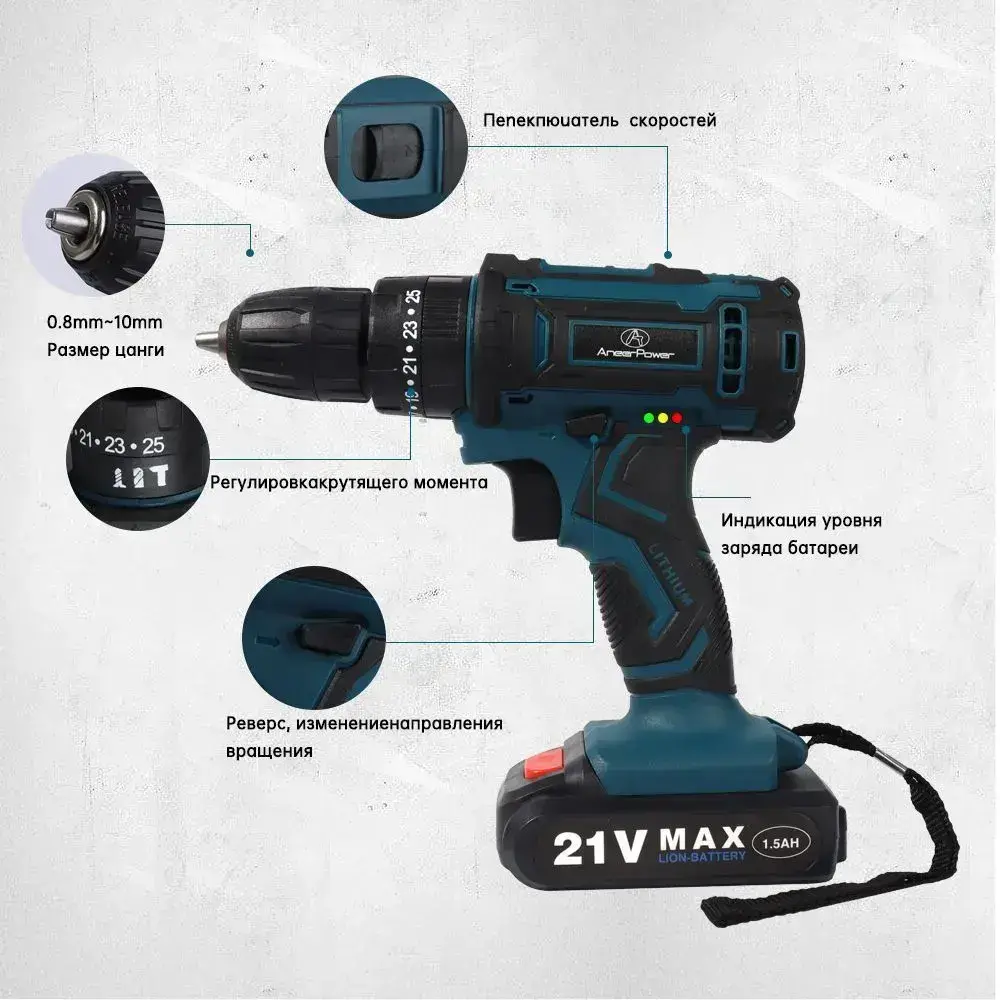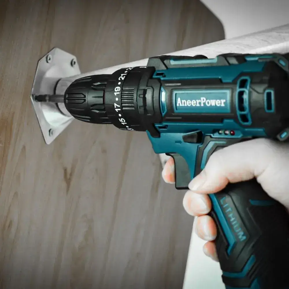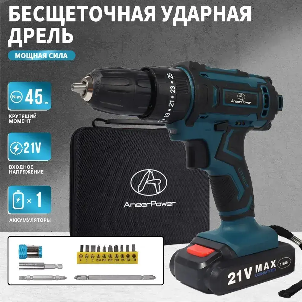 Аккумуляторная бесщеточная электродрель АneerPower 1 Аккумулятор 21 В 1,5 Ач Крутящий момент 25+3 2-скоростная коробка передач 3 рабочий статус В комплект входит 14 насадок для электродрели