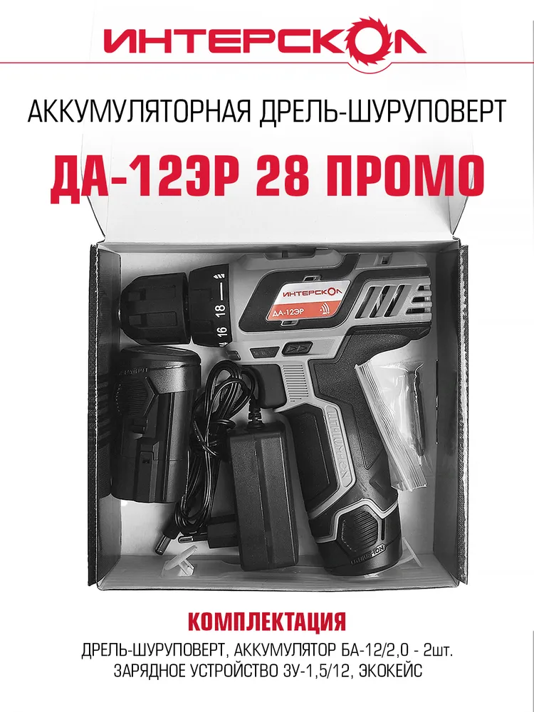Аккумуляторная дрель-шуруповерт ИНТЕРСКОЛ ДА-12ЭР ПРОМО, 434.2.2.20, Li-ion, 2 аккум., 2Ач