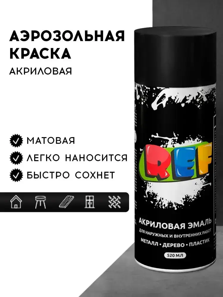 Акриловая краска аэрозольная 520 мл ЧЕРНЫЙ МАТОВЫЙ, быстросохнущая, универсальная / REF / эмаль в баллончике, для декора, мебели, дерева, металла, стен