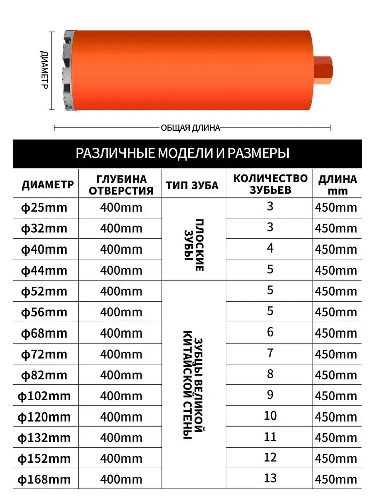 Алмазная коронка по бетону , мокрое бурение диаметр 52х450мм, Нарезной M22