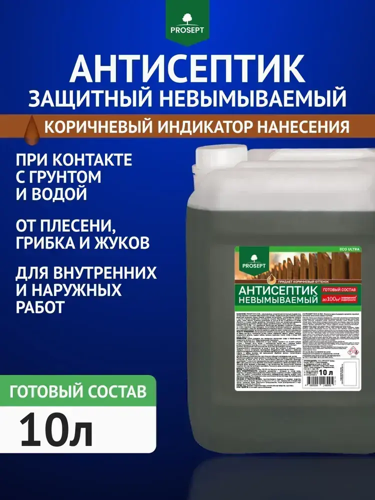 Антисептик для дерева невымываемый коричневый PROSEPT ECO ULTRA пропитка для внутренних и наружных работ, и обработка древесины от гниения 10 л (арт. 062-10)