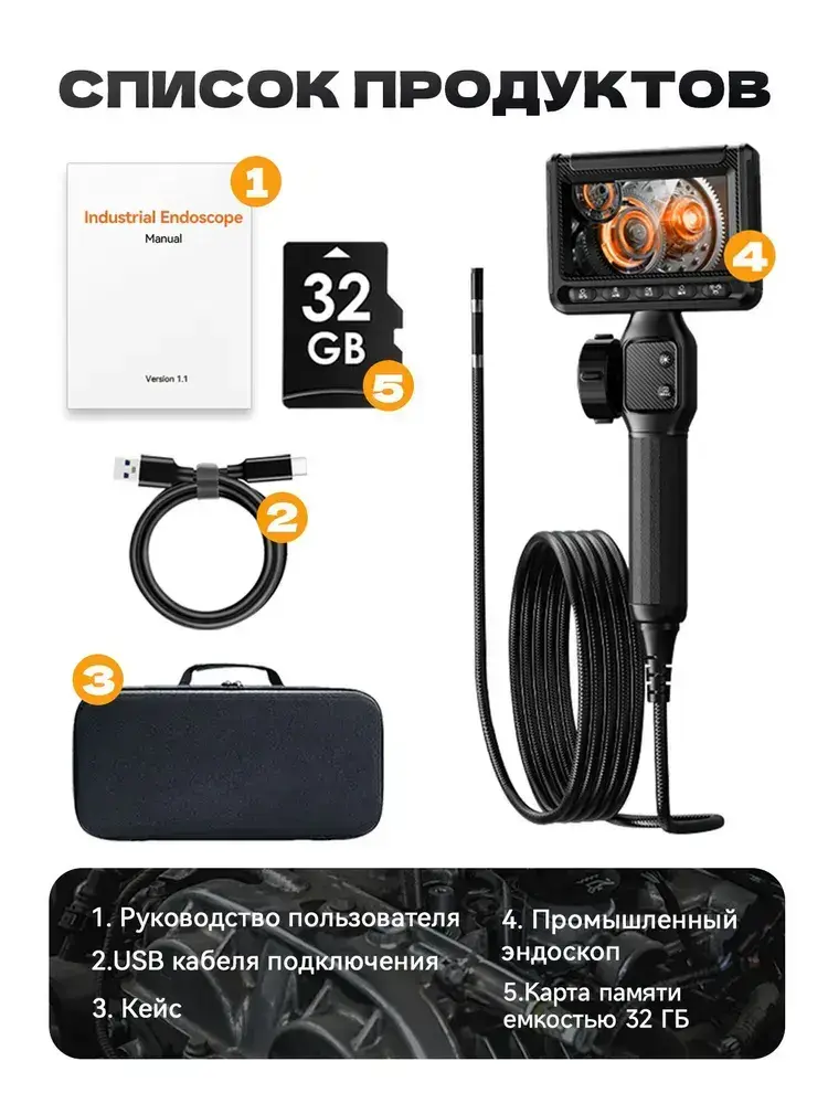 Автоэндоскоп с экраном, 6мм, 1м, поворот 180 , карта 32ГБ, водо- и маслостойкий