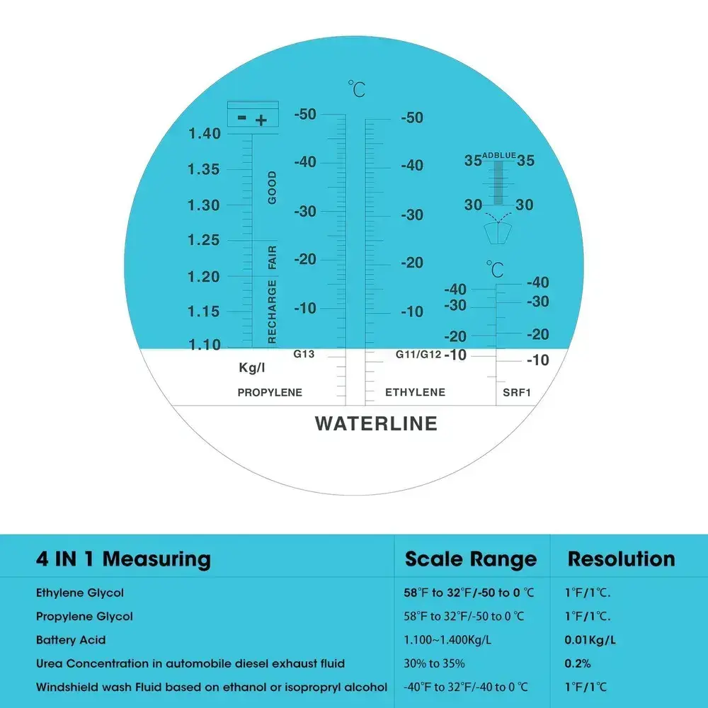 Автомобильный рефрактометр 4 в 1 - (RZ115), для антифриза, охлаждающей жидкости, электролита и мочевины