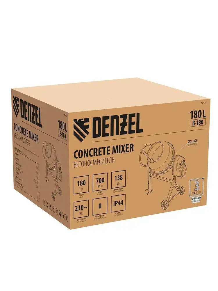 Бетономешалка строительная DENZEL B-180, 180 л объем бака и 700 Вт мощность, чугунный венец и разъемный узел оси барабана, термозащита и кнопка аварийного выключения, бетоносмеситель 95423