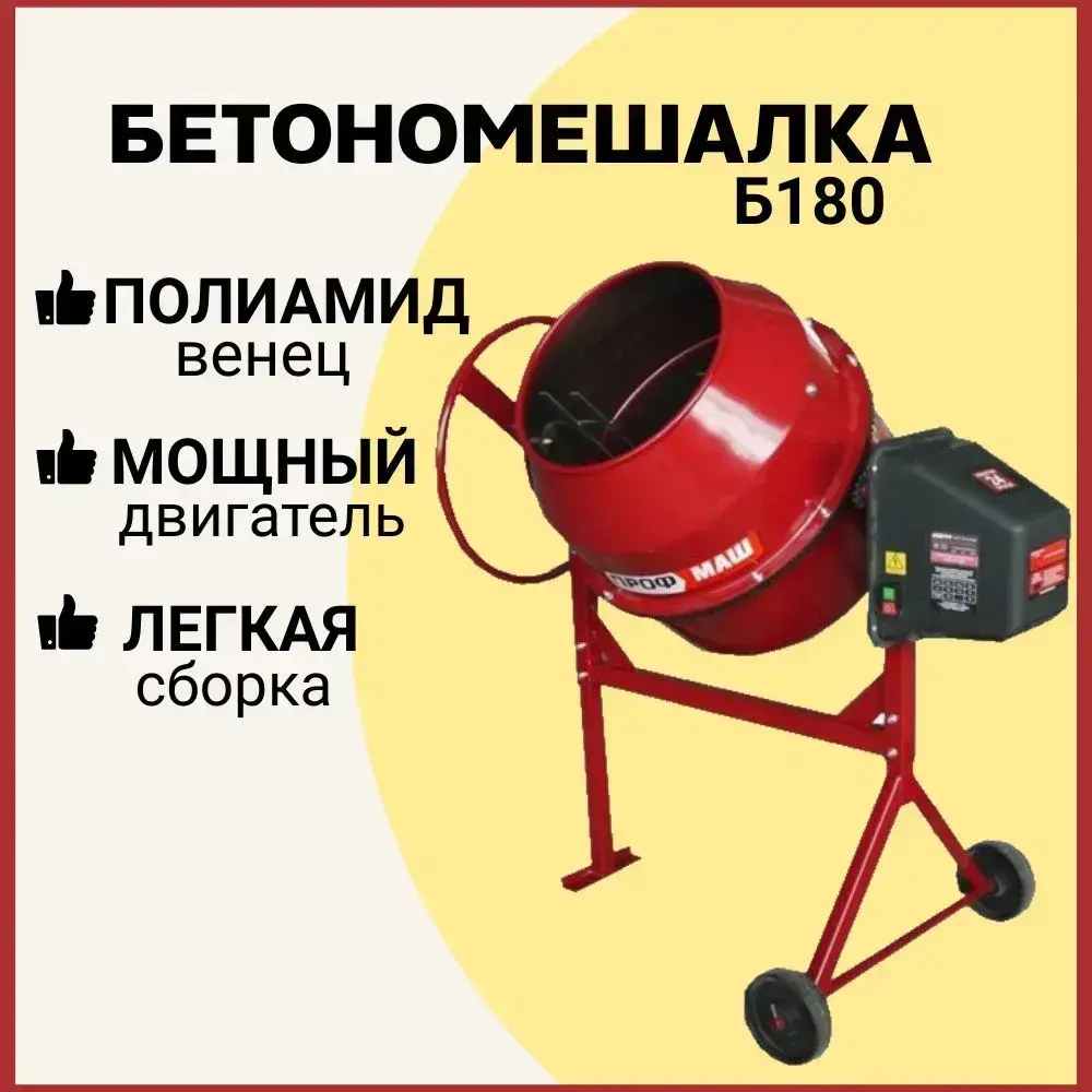 Бетономешалка строительная Профмаш Б180, полиамидный венец, объем 160 литров, мощность 700 Вт, бетоносмеситель электрический