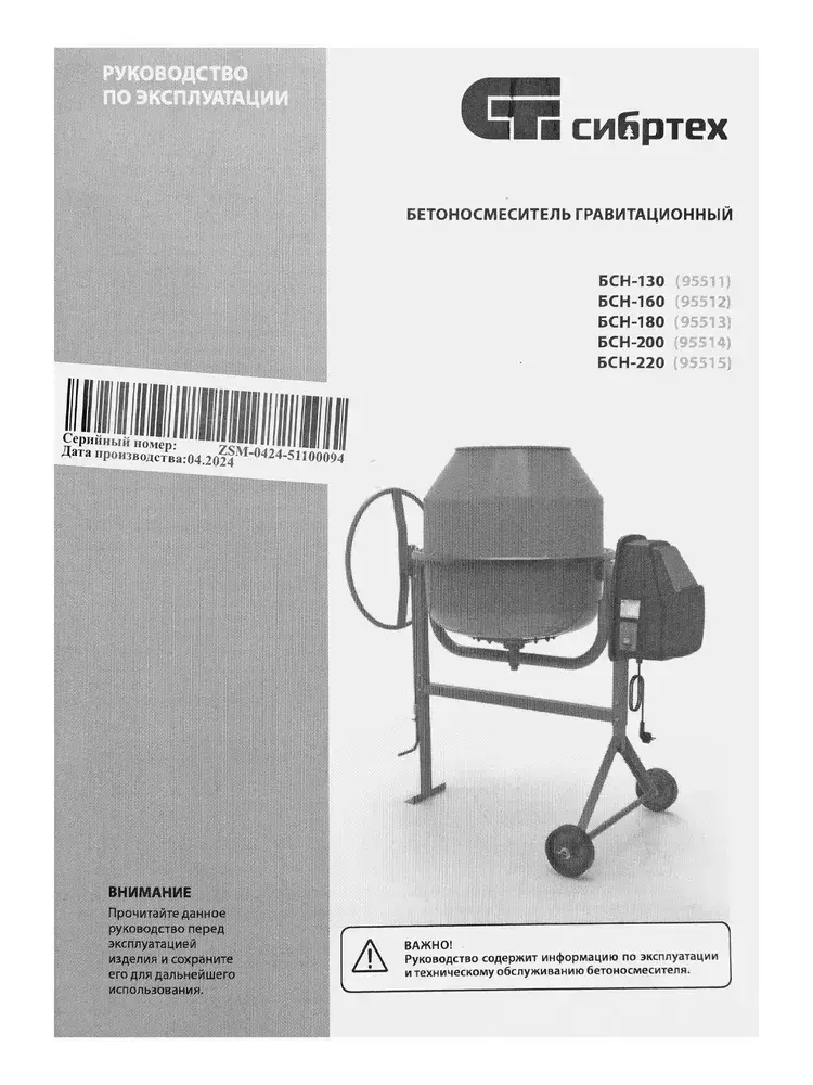 Бетономешалка строительная СИБРТЕХ, БСН-200, 200 л объем бака и 800 Вт мощность, чугунный венец и поликлиновый ремень, защита от перегрева и случайного пуска, без редуктора, бетоносмеситель, 95514