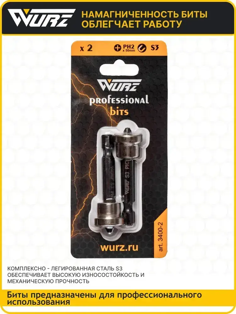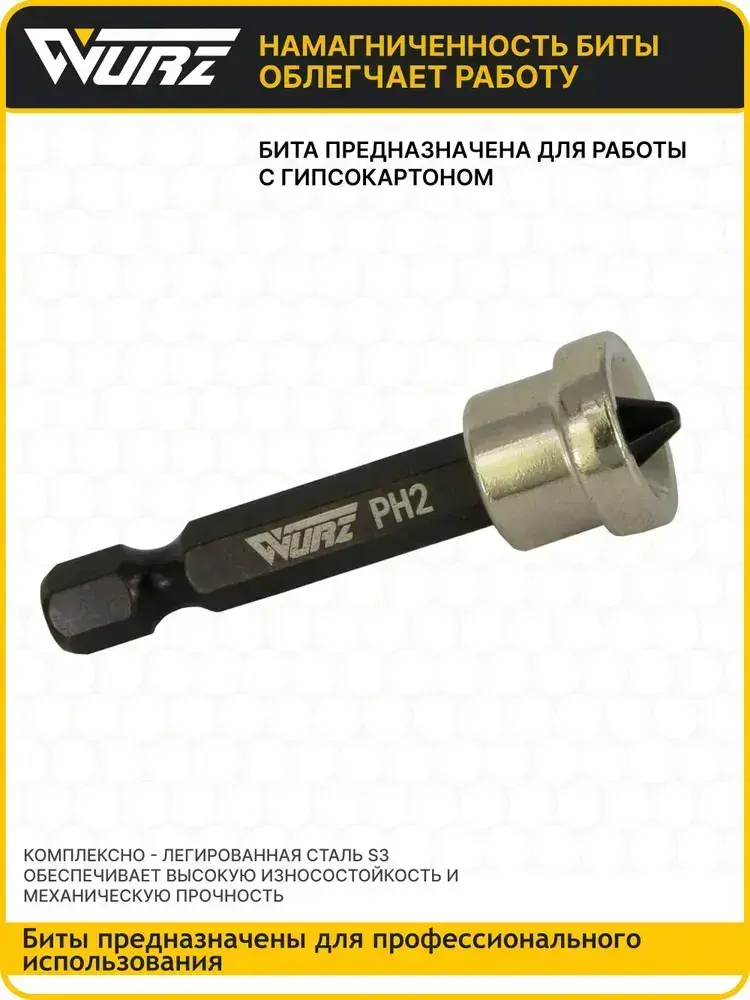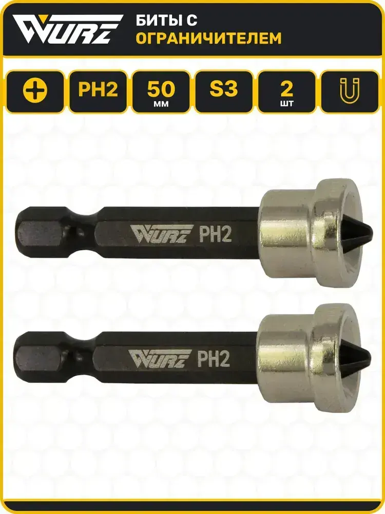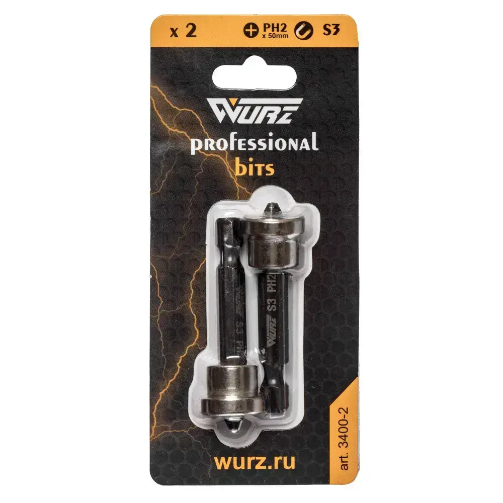 Бита PH2 x 50мм S3 2шт. с ограничителем для гипсокартона WURZ 3400-2