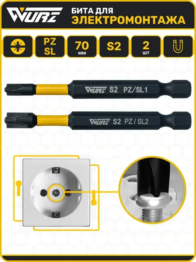Биты для электромонтажа PZ/SL1 и PZ/SL2 70мм 2шт. S2 намагниченные WURZ 360212