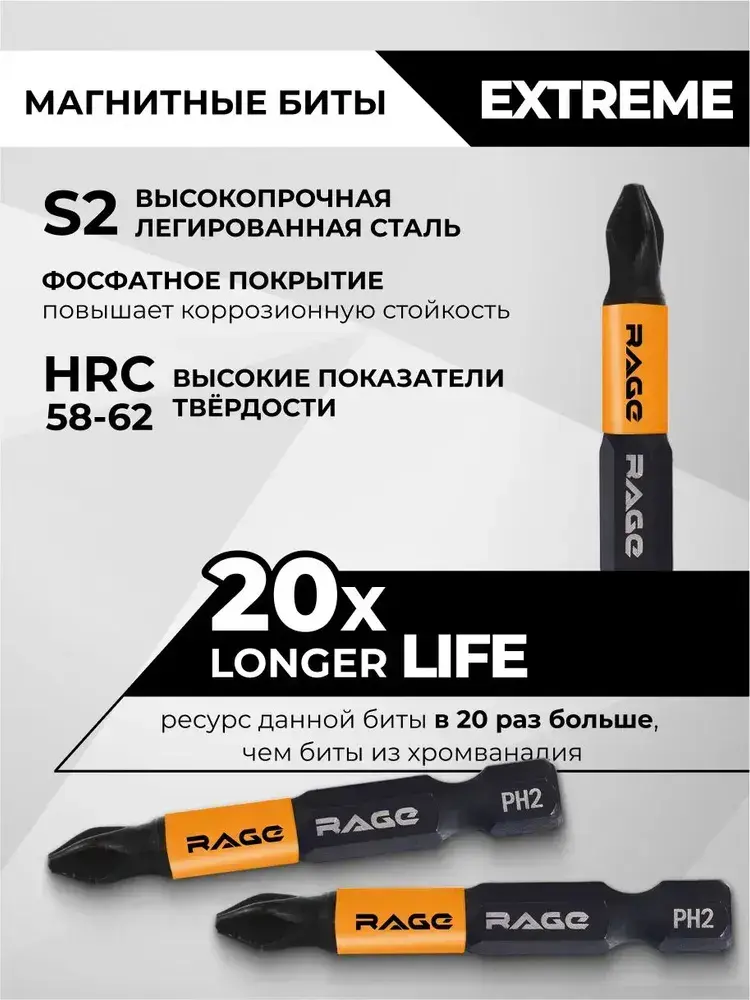 Биты магнитные S2 PH2 x 50 мм 2 шт RAGE by VIRA