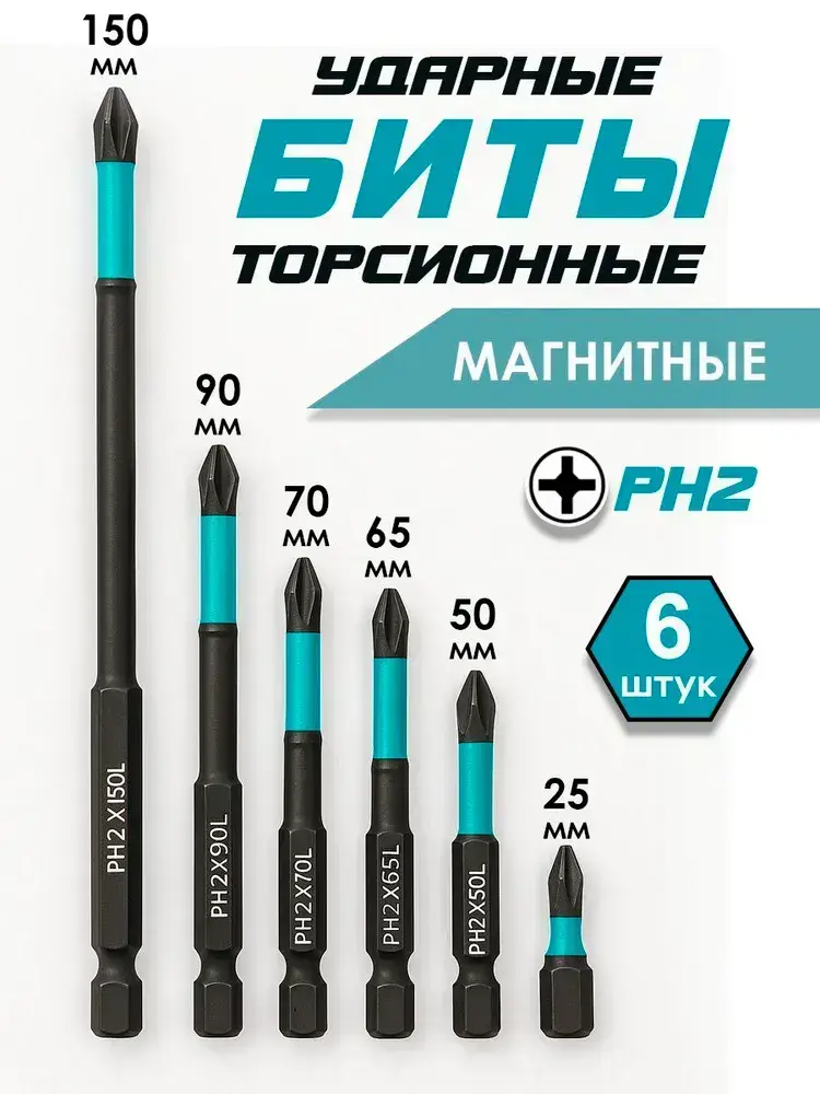 Биты магнитные усиленные PH2 для шуруповерта, 6шт
