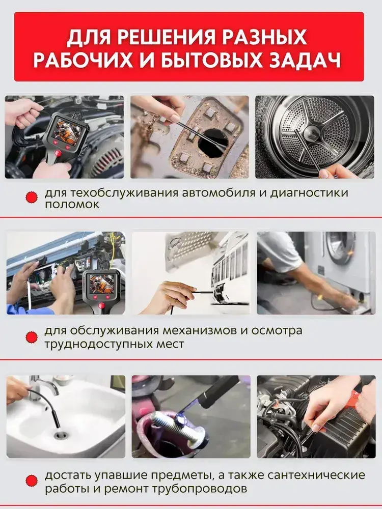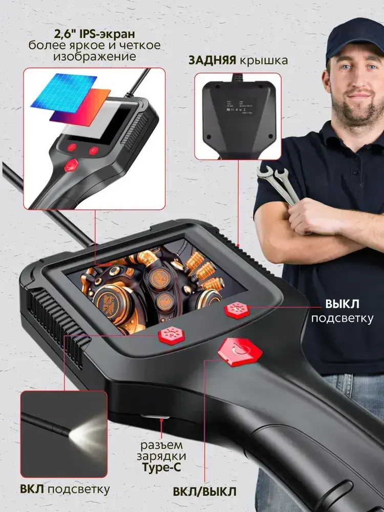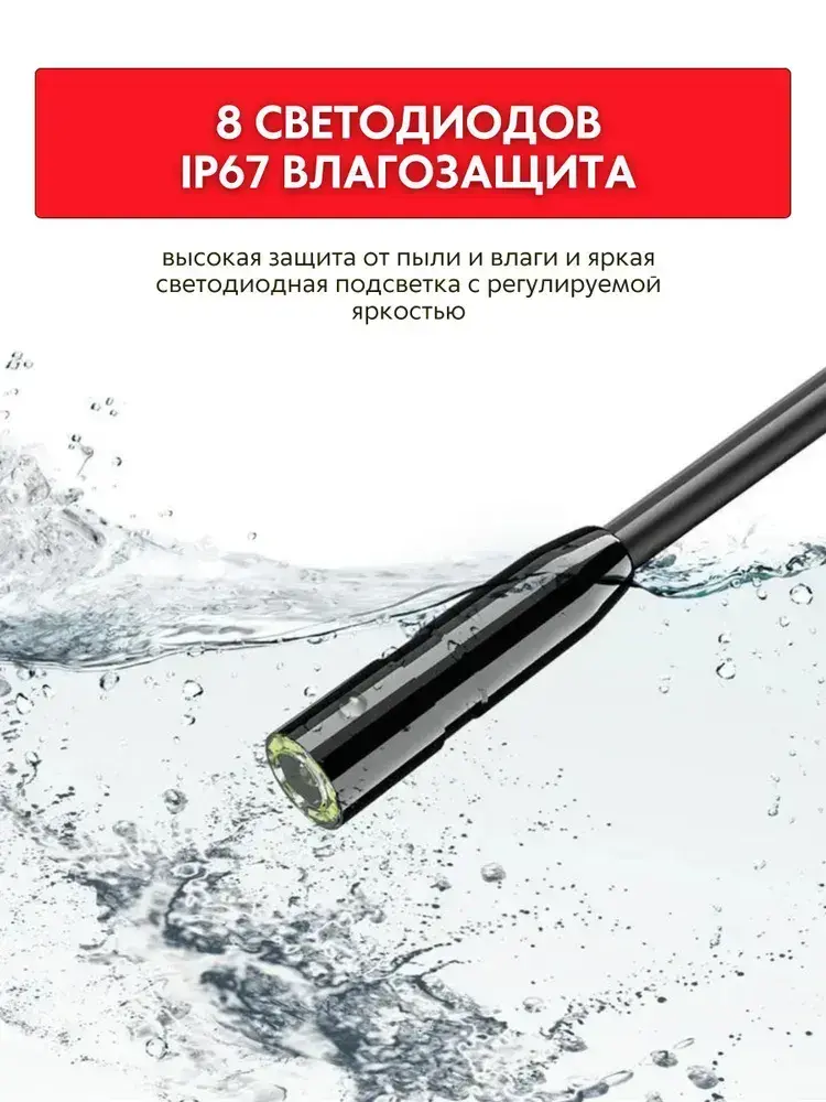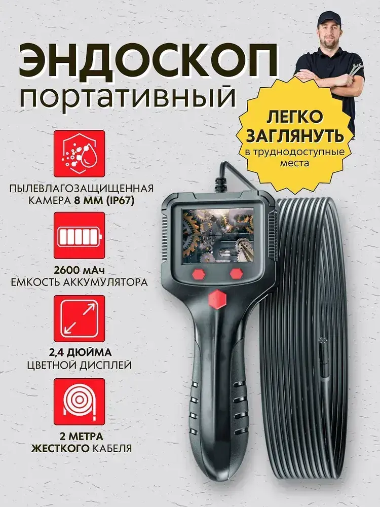 Бытовой камера-эндоскоп автомобильный с гибким кабелем длинной 2 м., 8 мм светодиодный объектив, IPS экран с водонепроницаемый 2,4 дюйма