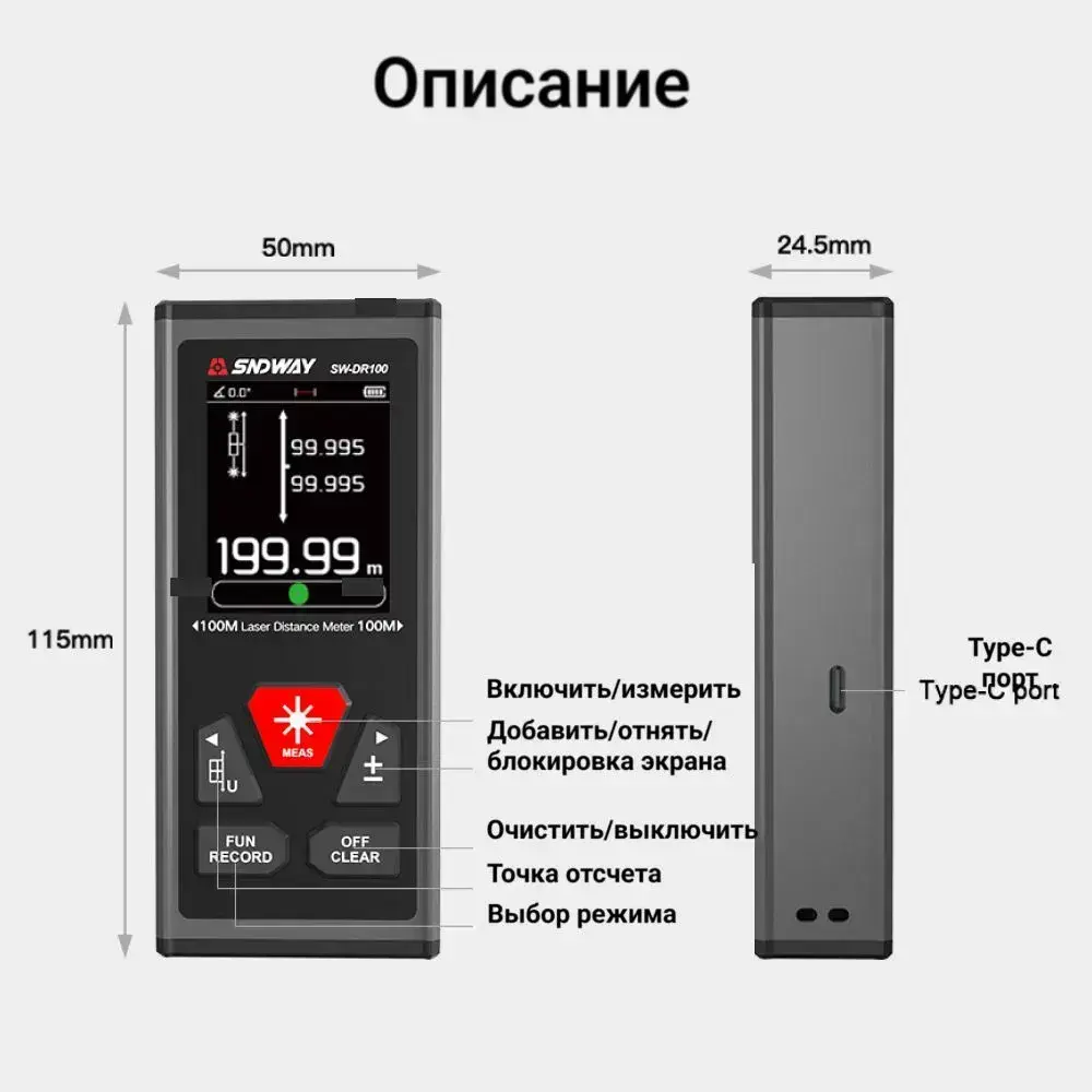 Дальномер лазерный SNDWAY SW-DG100, 200 метров, зеленый лазер, двусторонний, питание от встроенного аккумулятора