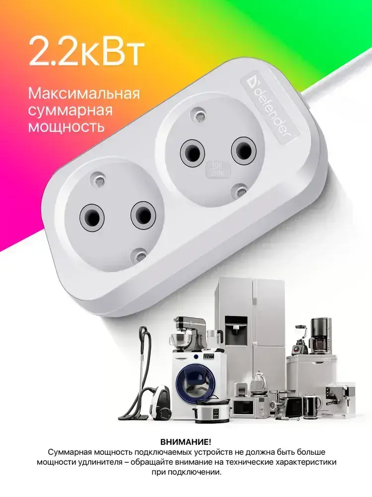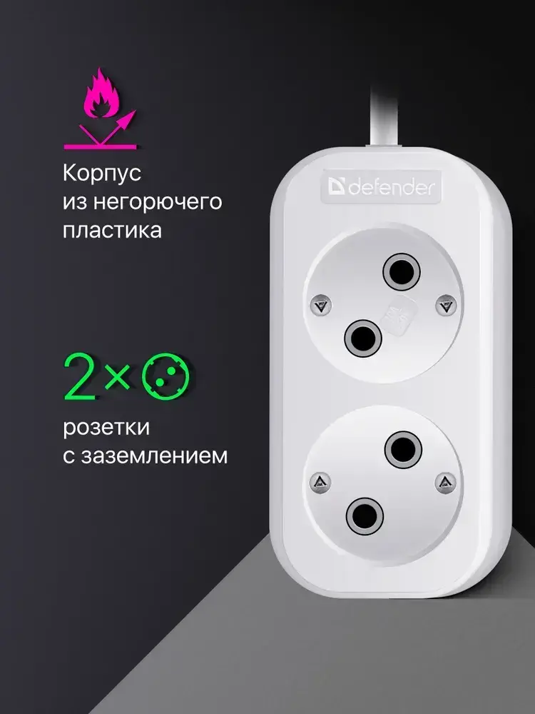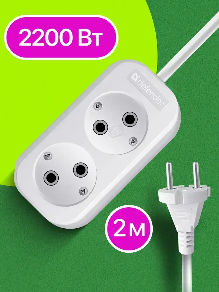 Defender Удлинитель сетевой 2 м белый, 2 розетки без заземления
