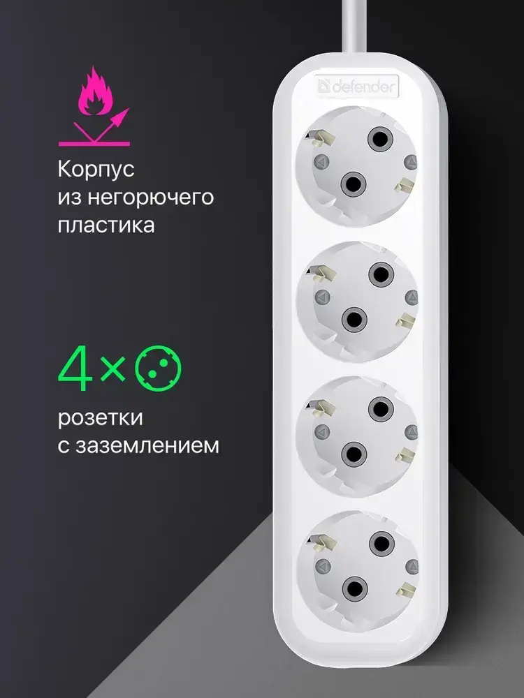 DEFENDER Удлинитель сетевой 2м, 4 розетки с заземлением, 16А