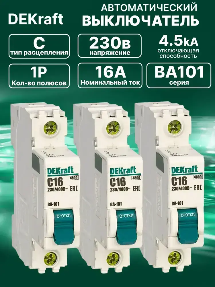 DEKraft Автоматический выключатель однополюсный 16А х-ка C ВА-101 4,5кА 3шт