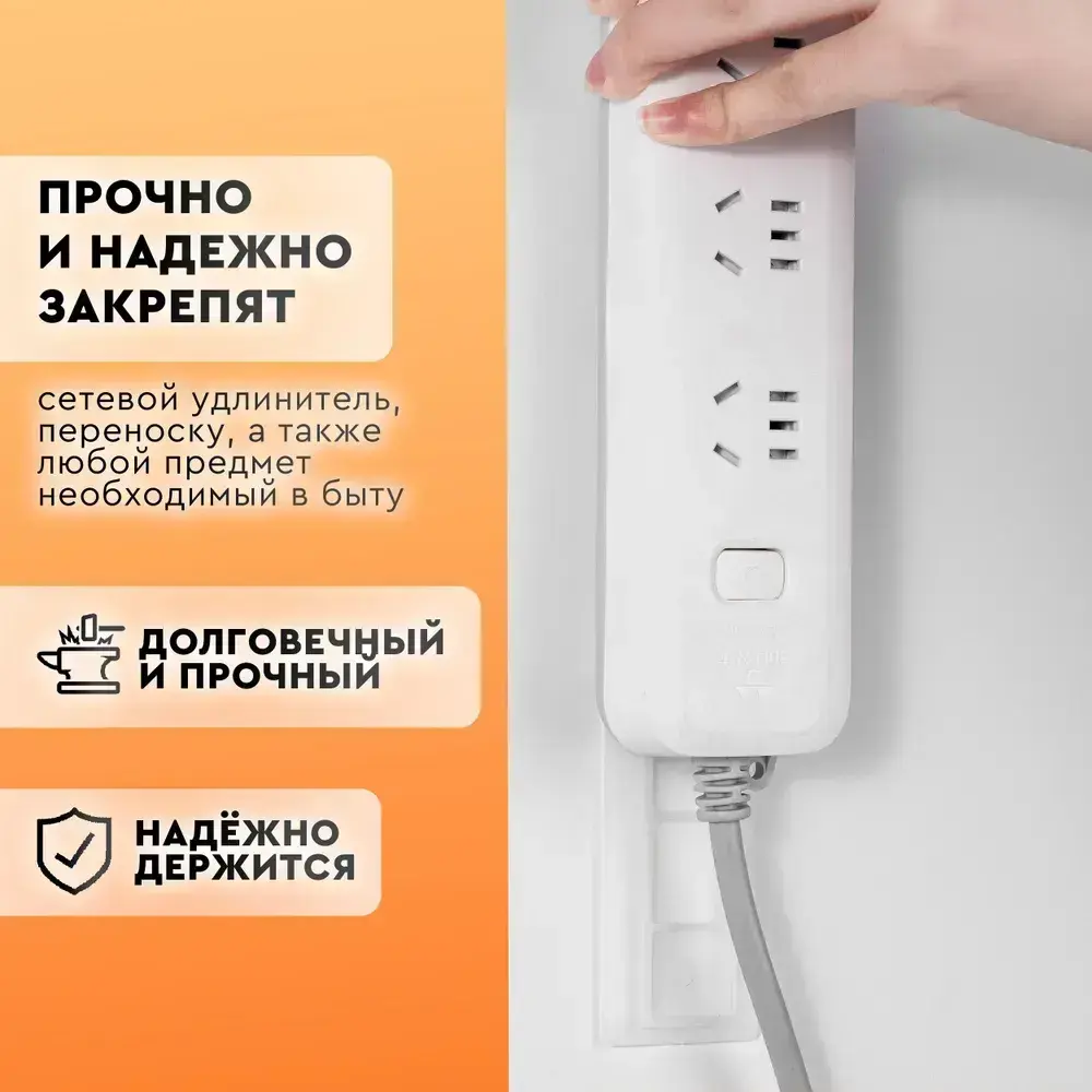 Держатель для удлинителя, самоклеящийся. Крепление для сетевого фильтра. Кронштейн для роутера, крепление для картин 2 шт., размер 10х4 см. Цвет белый.