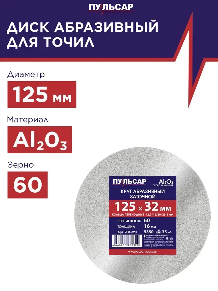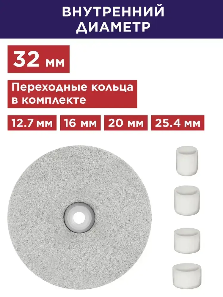 Диск абразивный для точила ПУЛЬСАР 125 х 32 х 16 мм F 60 белый (Al2O3) + кольца переходные