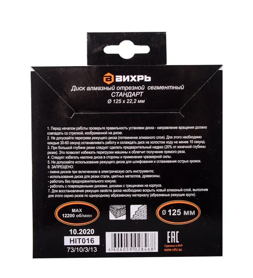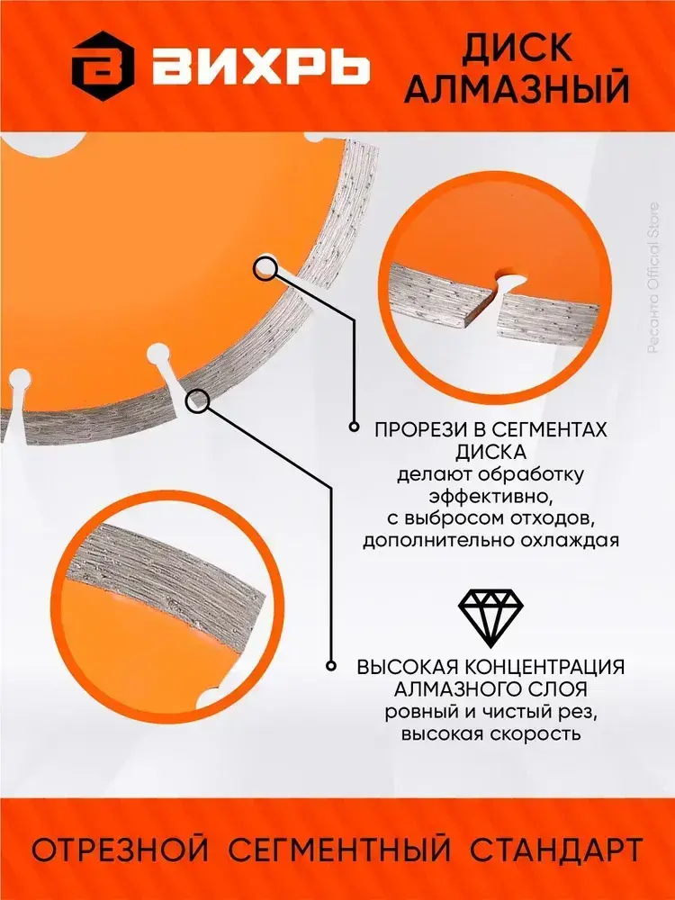 Диск алмазный отрезной сегментный СТАНДАРТ, 125 х 22,2 мм, сухая резка Вихрь