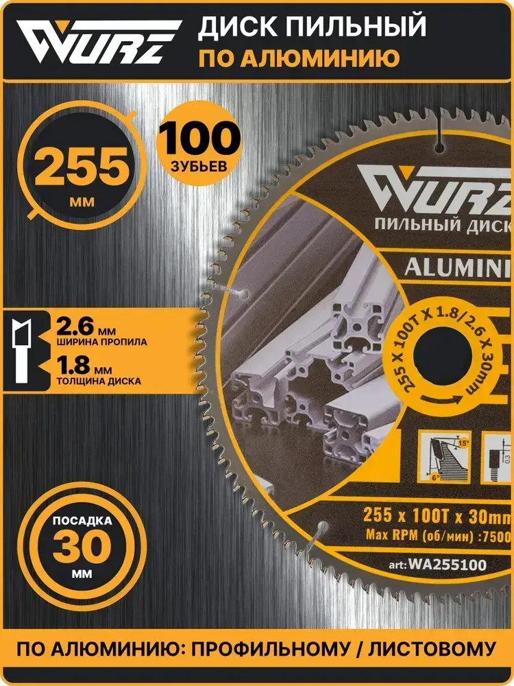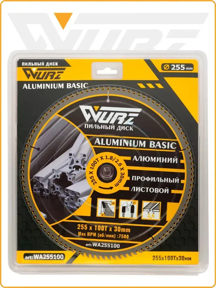 Диск пильный по алюминию 255х100Тх1.8/2.6х30мм WURZ WA255100