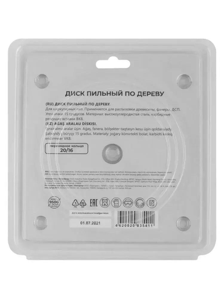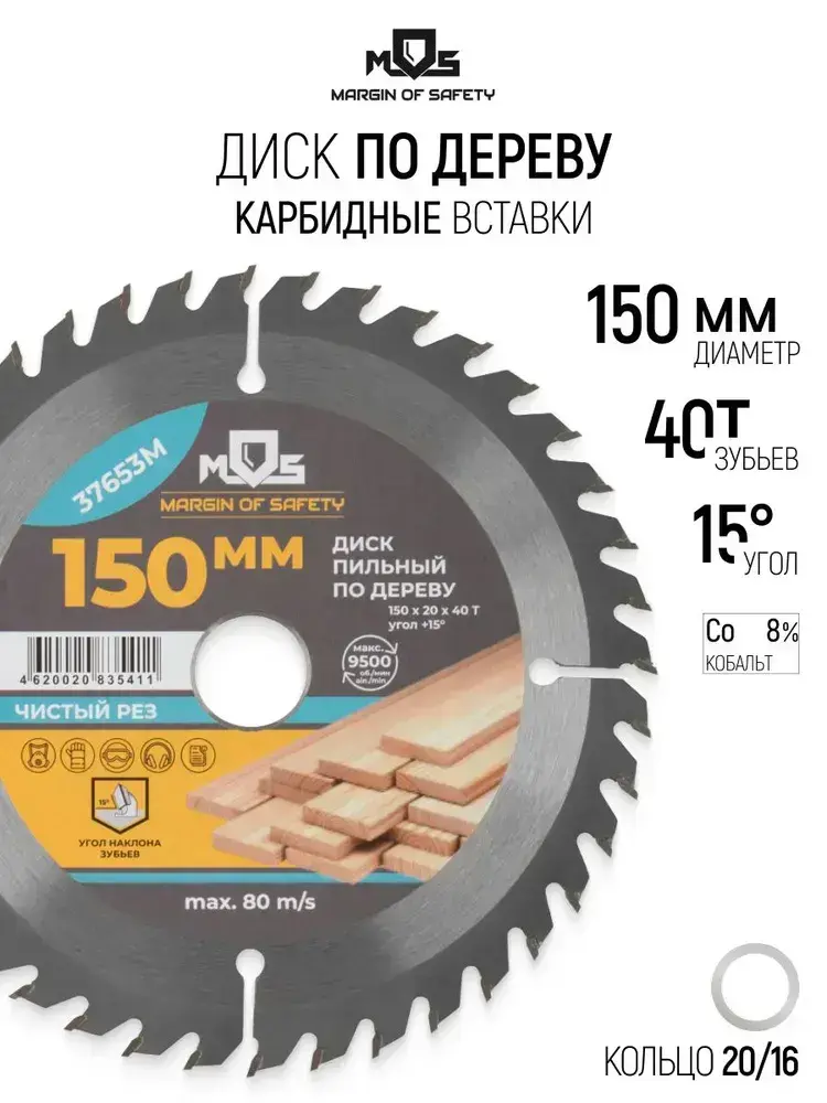 Диск пильный по дереву 150 х 20 х 40T + кольцо 20/16 мм для циркулярной пилы твердосплавные зубья ВК8 карбид вольфрама угол 15