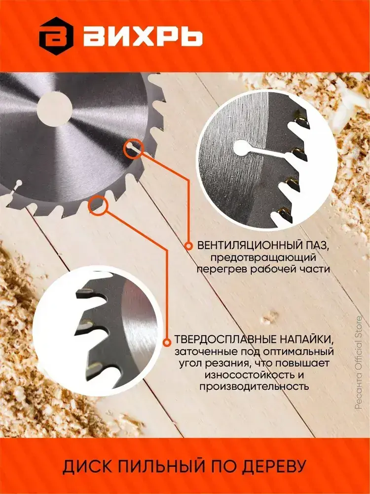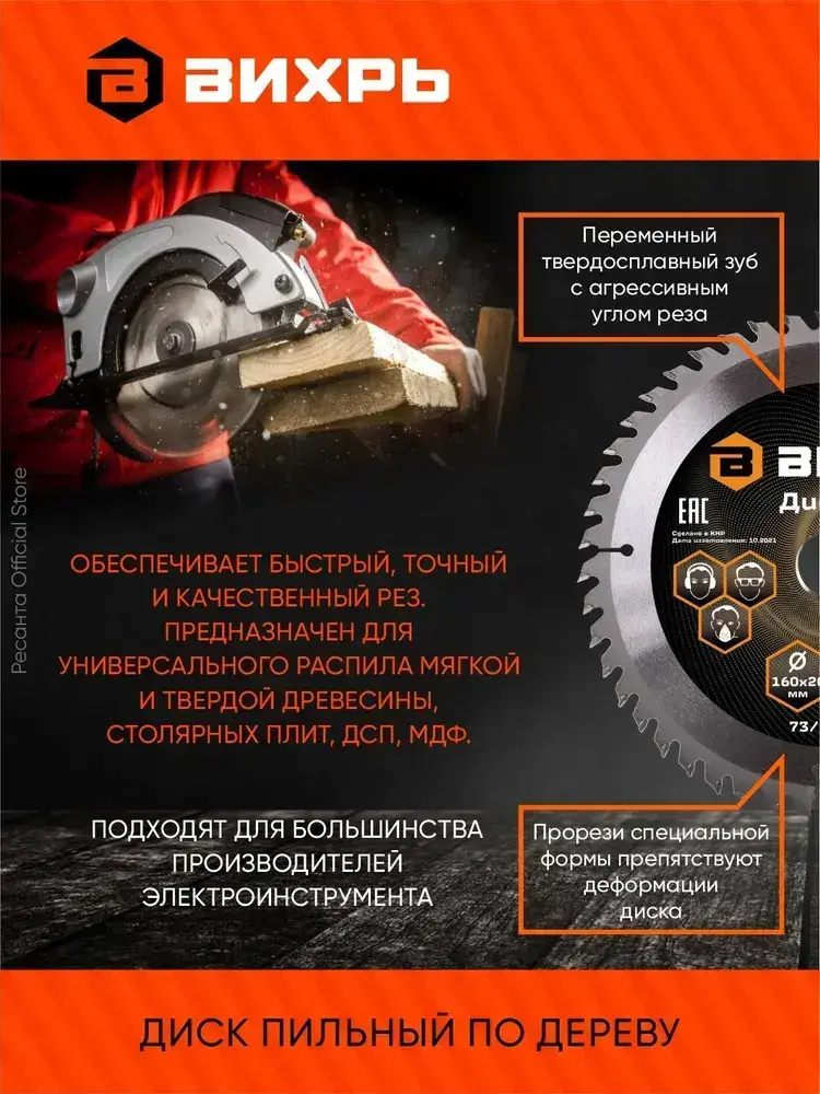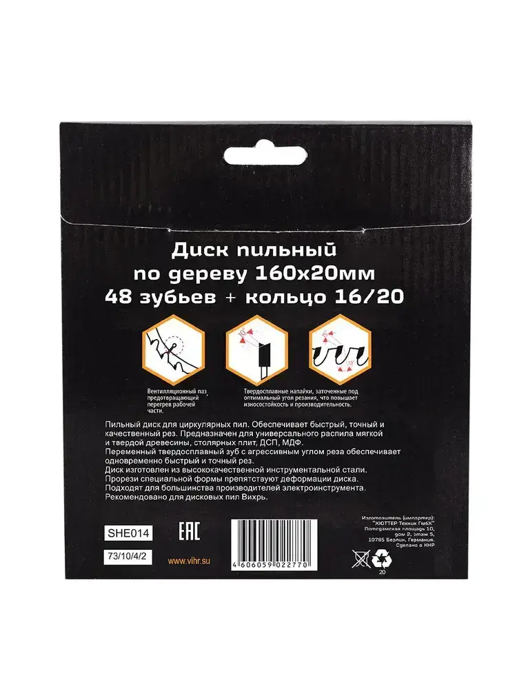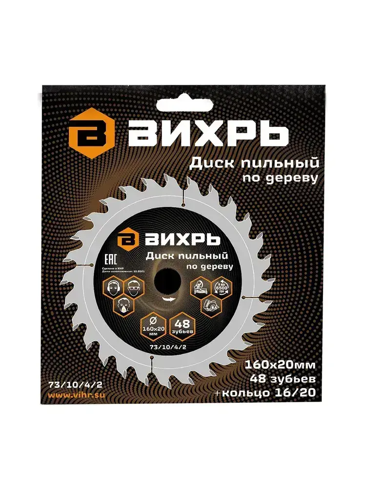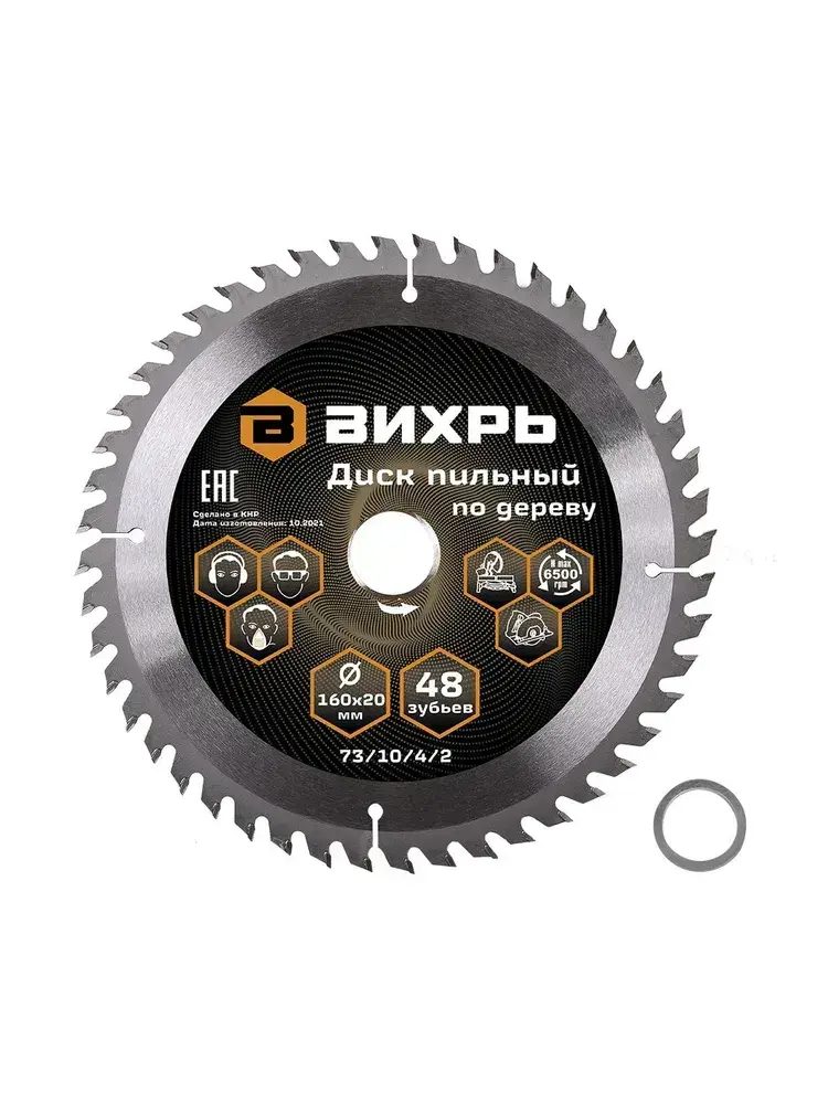 Диск пильный по дереву 160х20 мм - 48 зубьев+кольцо 16/20 Вихрь; для циркулярки, для дисковой пилы