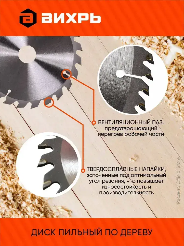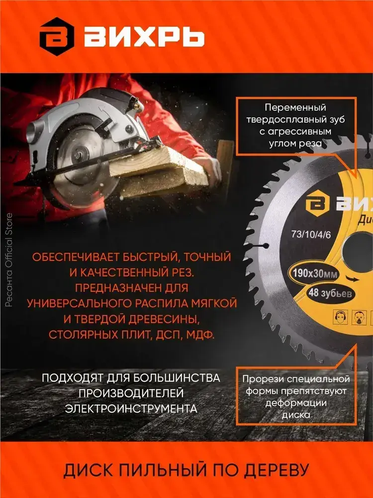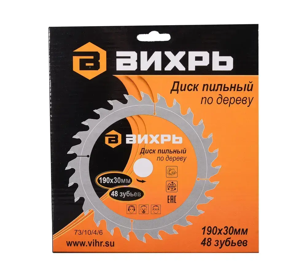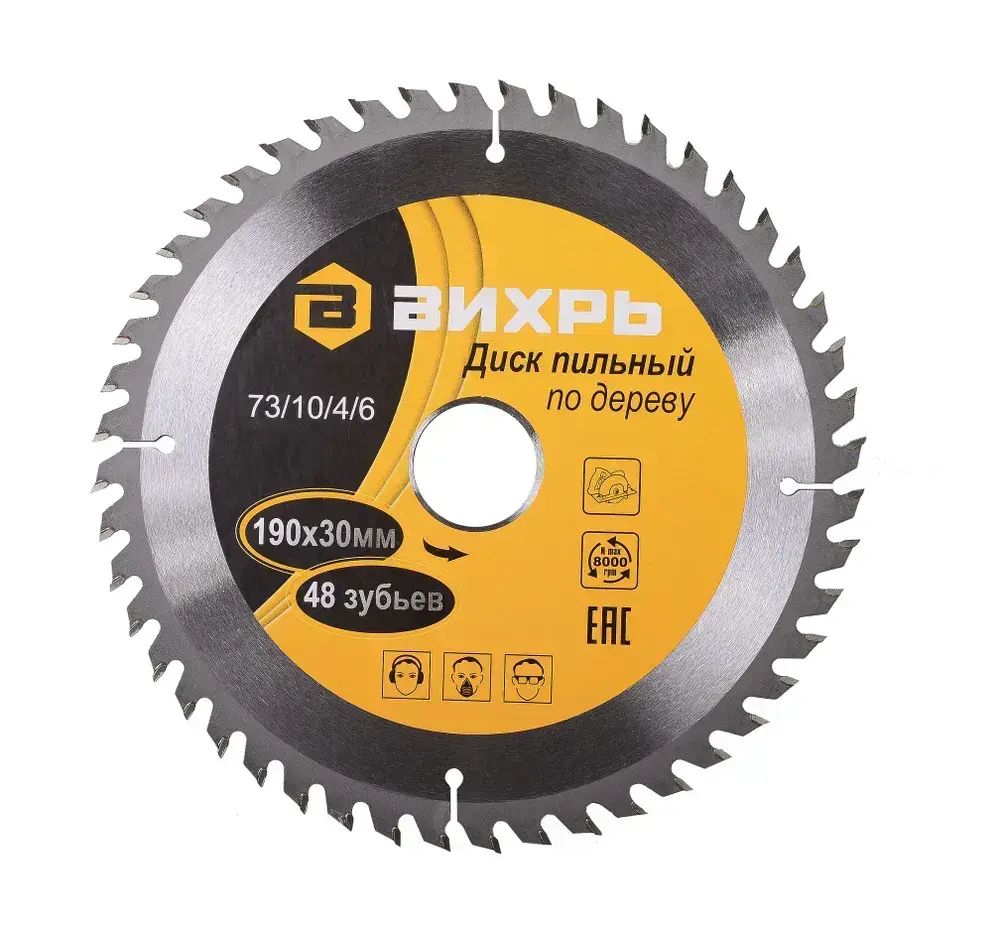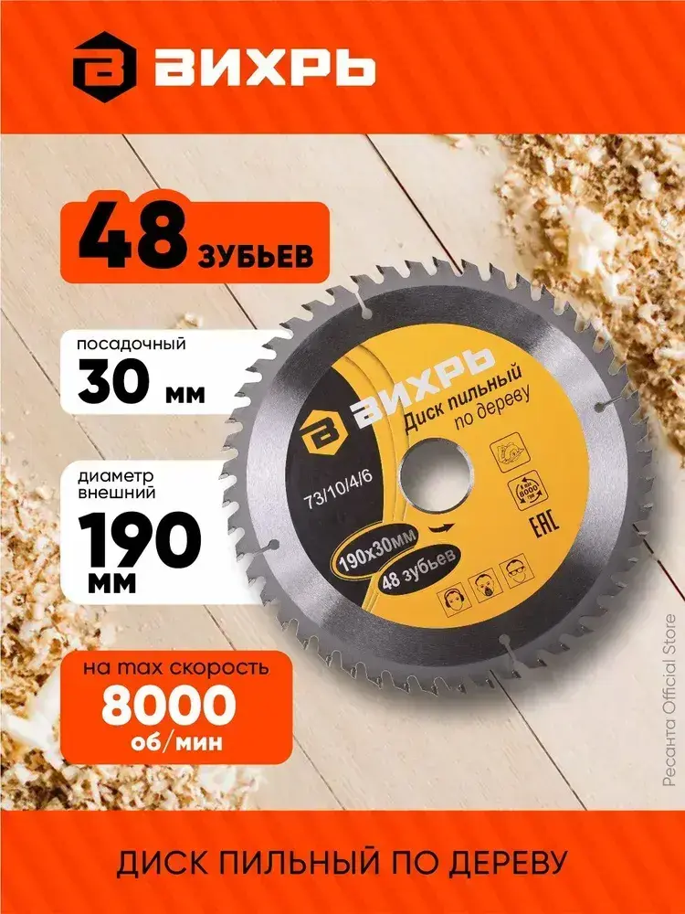 Диск пильный по дереву 190х30 мм, 48 зубьев+кольца 16/30, 20/30 Вихрь; для циркулярки, дисковой пилы