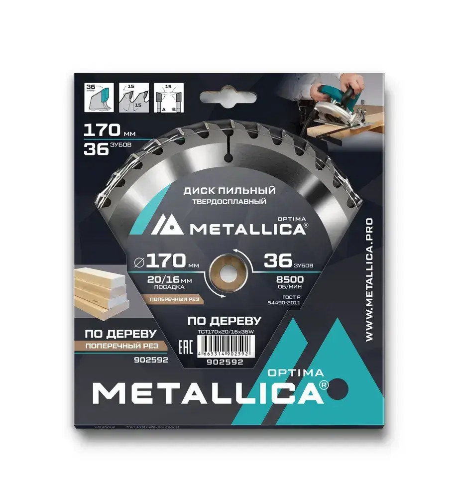 Диск пильный тв. сплав. METALLICA Optima 170x20/16 мм, 36 зубов, Т 2,4 мм по дереву прод/поперечн