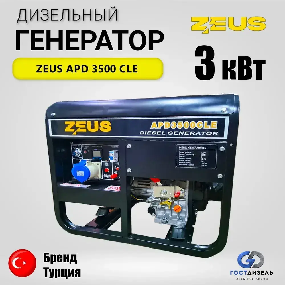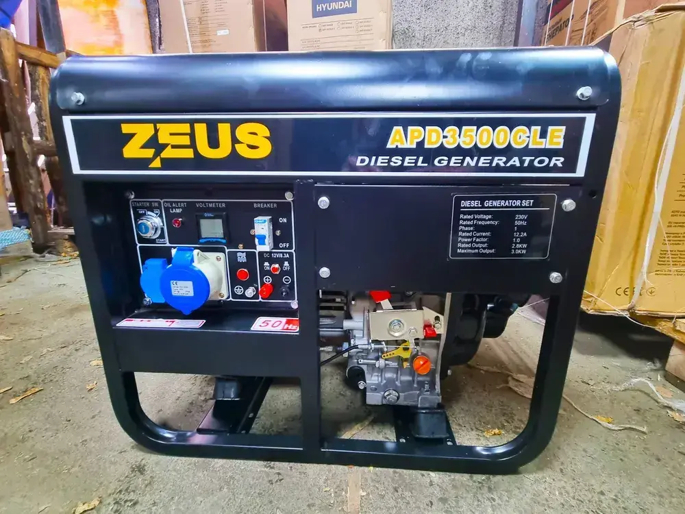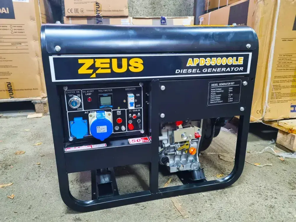 Дизельный генератор Zeus APD 3500 CLE 3 кВт с электростартером. В комплекте аккумулятор, колеса и набор фильтров для 1-го ТО