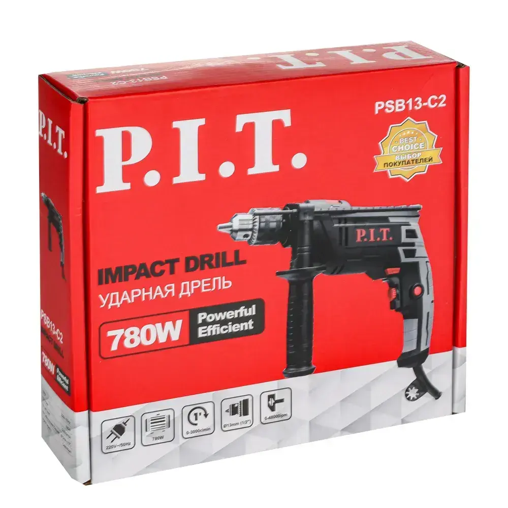 Дрель электрическая от сети ударная P.I.T. PSB13-C2, 780Вт, ударный механизм, реверс, регулировка об. 0-3000