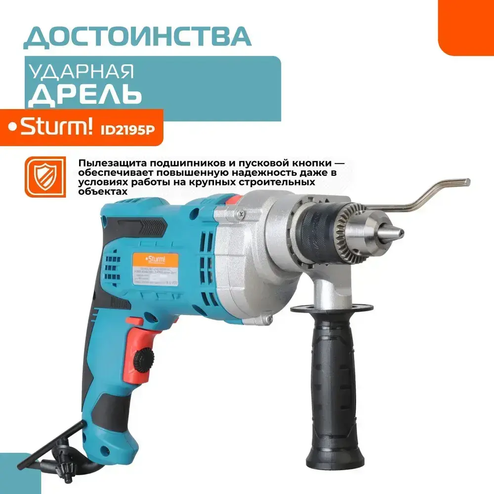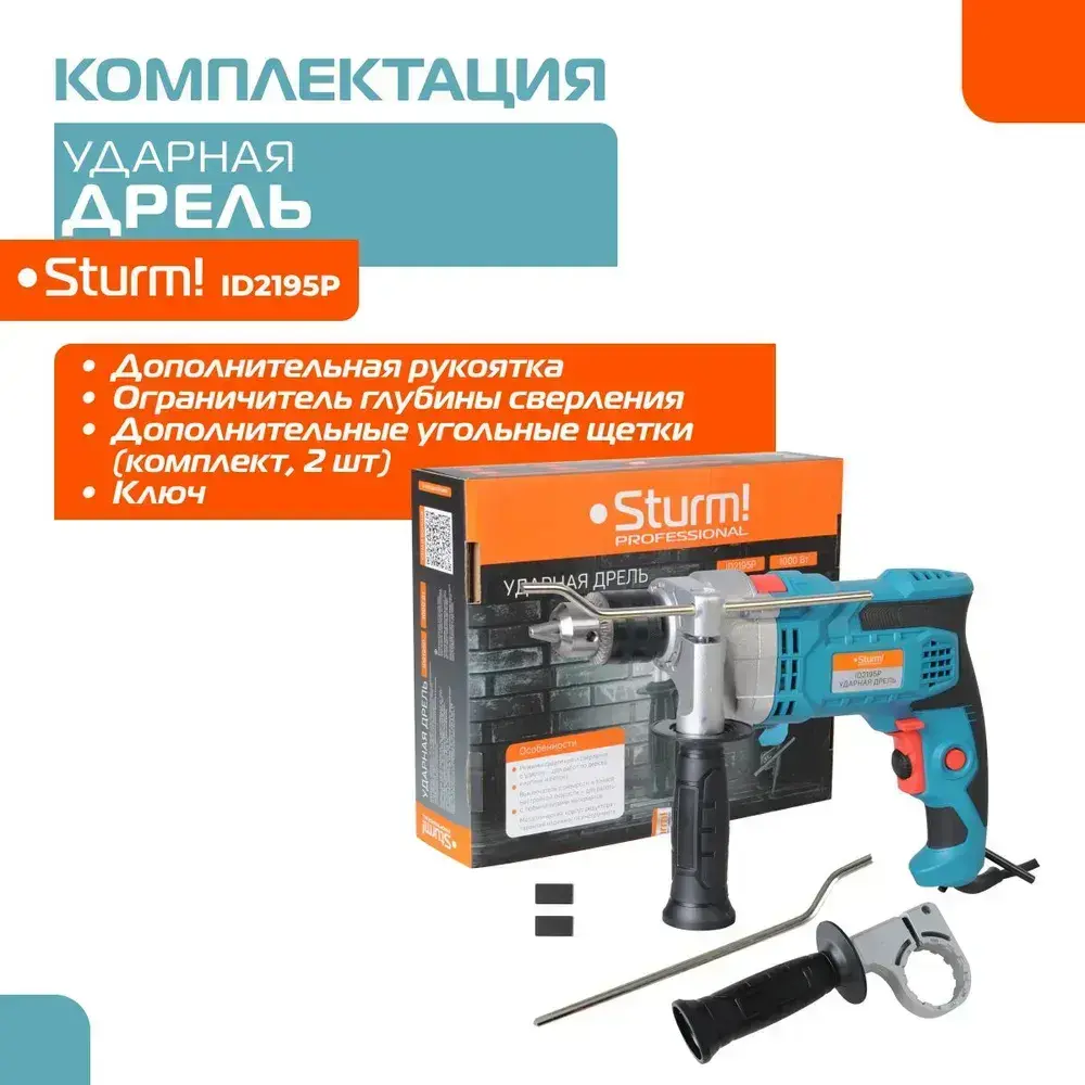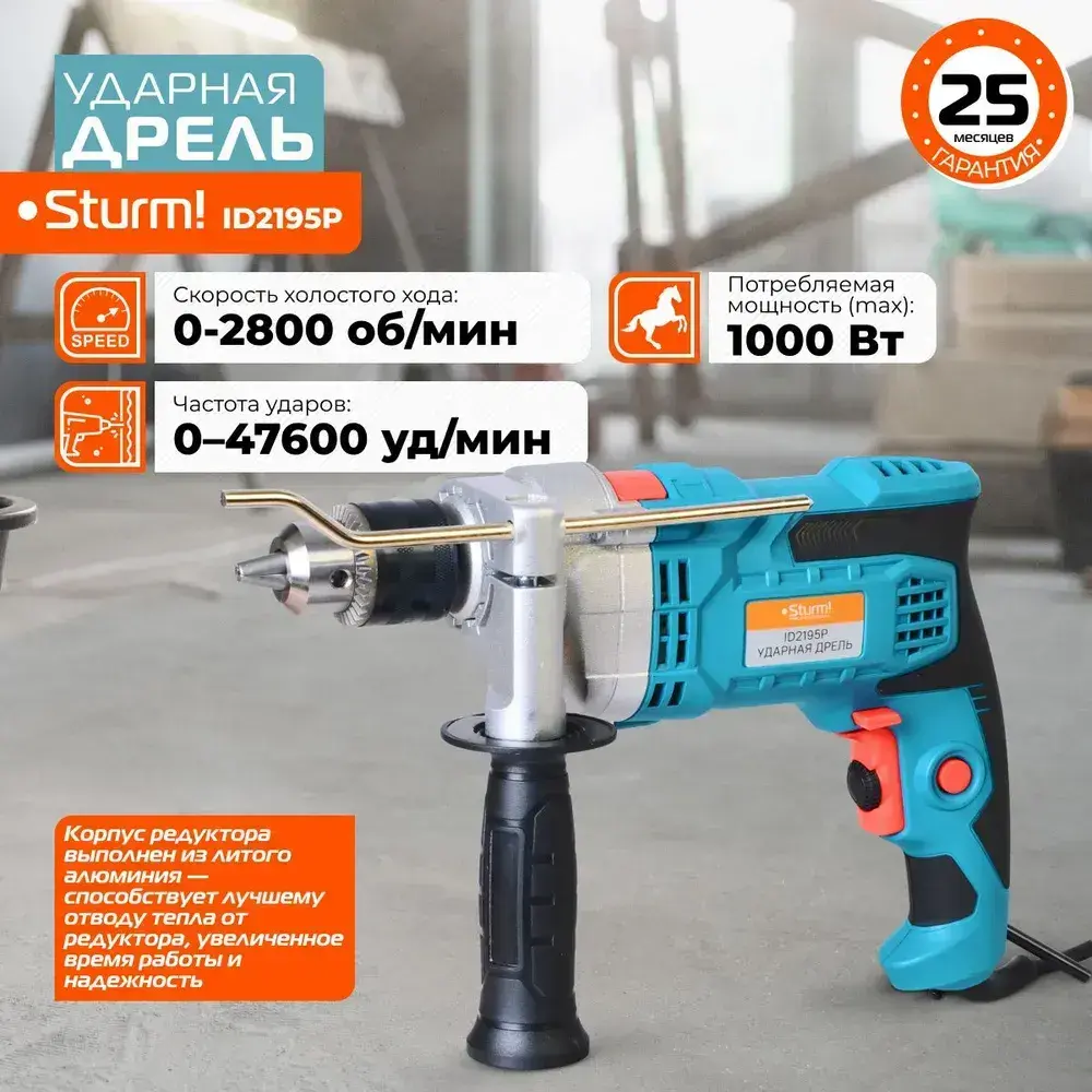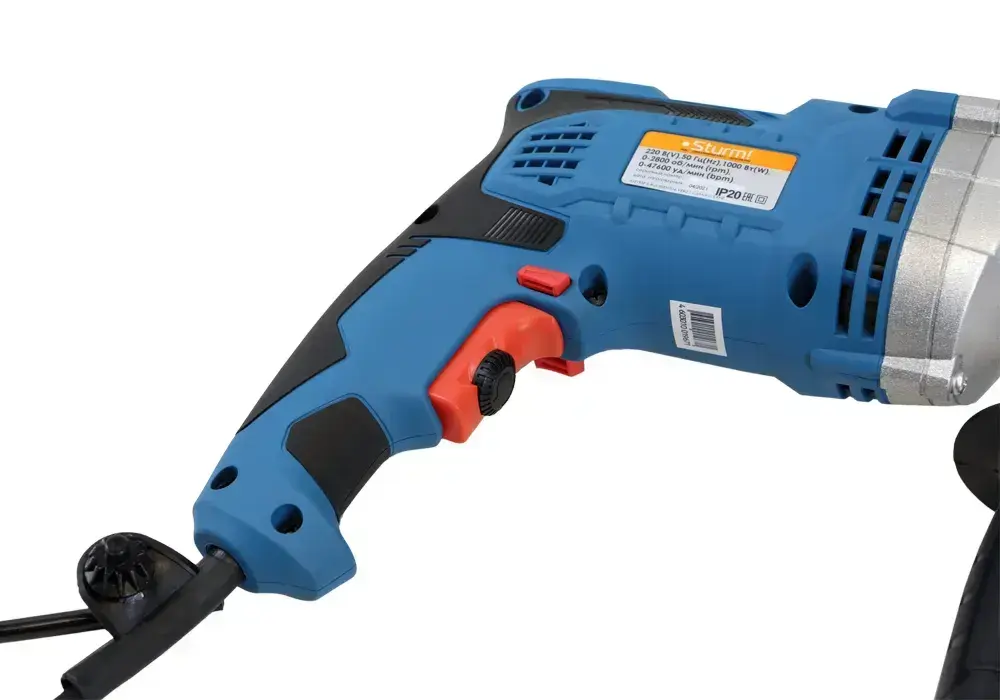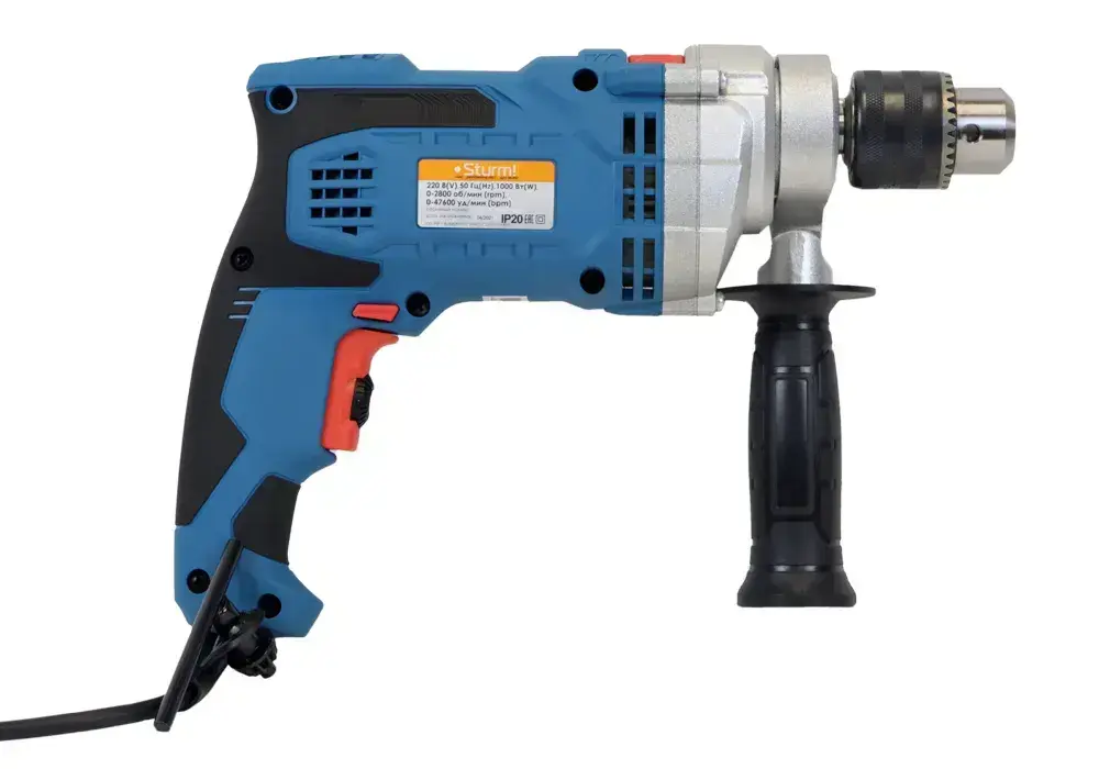 Дрель электрическая ударная мощность 1000Вт, обороты 2800об/мин, частота ударов 47600уд/мин, патрон 13мм, кабель 4м, металлический редуктор