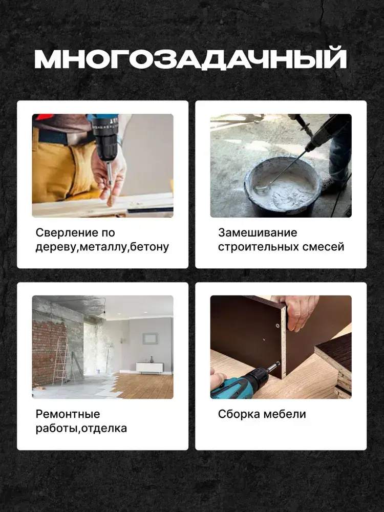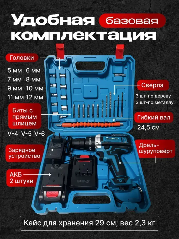 Дрель шуруповерт аккумуляторная, ударный с набором и 2-мя аккумуляторами