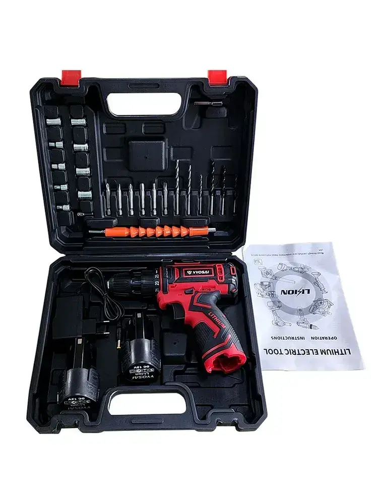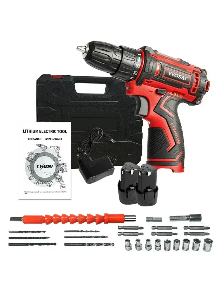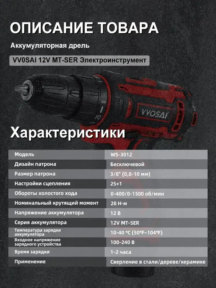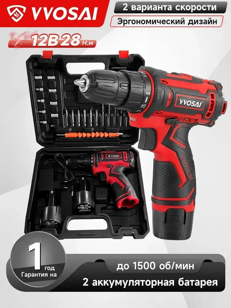 Дрель-шуруповерт аккумуляторная VVOSAI WS-3012-A2-SXP, 12В 28Нм, 2xLi-ion, ЗУ, аксессуары 24 штук, кейс для хранения