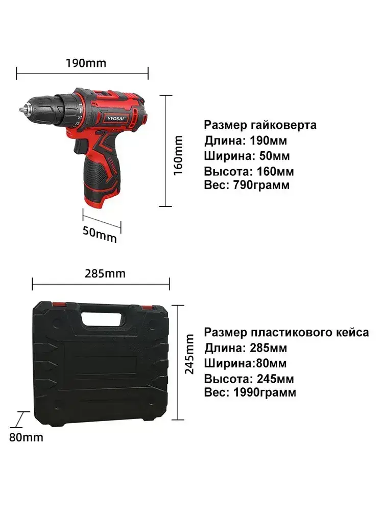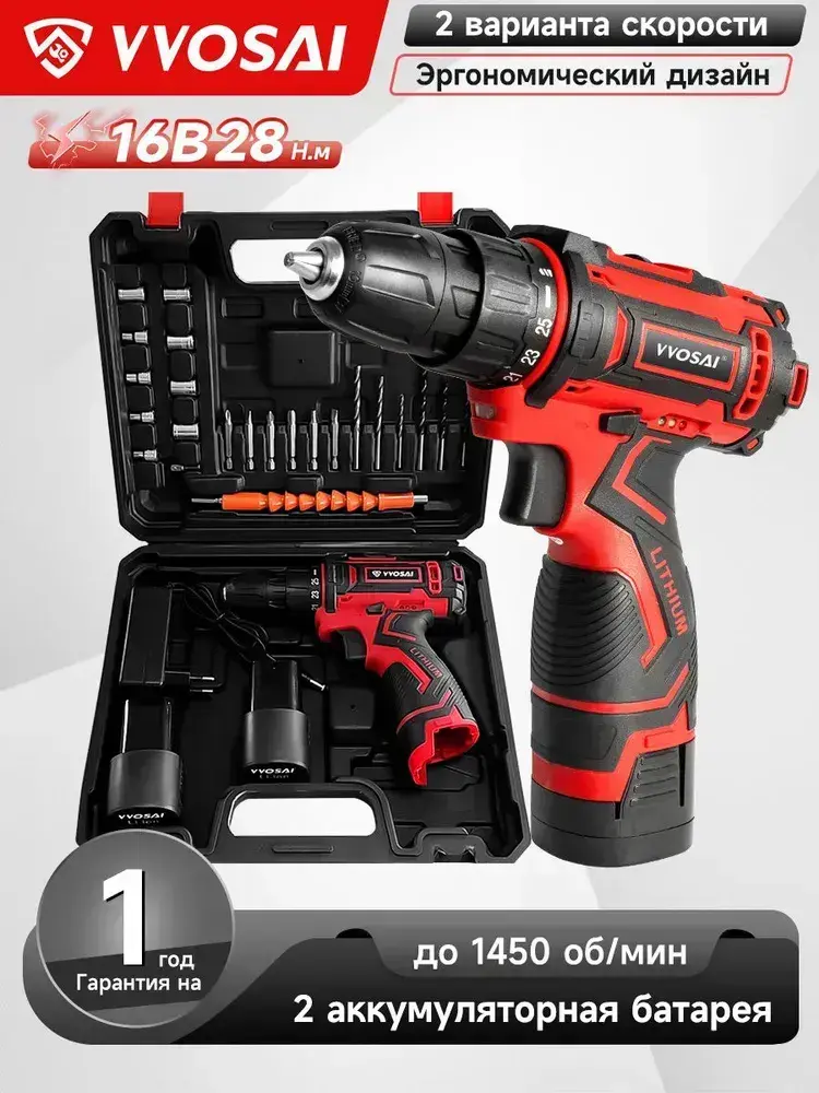 Дрель-шуруповерт аккумуляторная VVOSAI WS-3016-A2-SXP, 16В 36Нм, 2xLi-ion, ЗУ, аксессуары 24 штук, кейс для хранения
