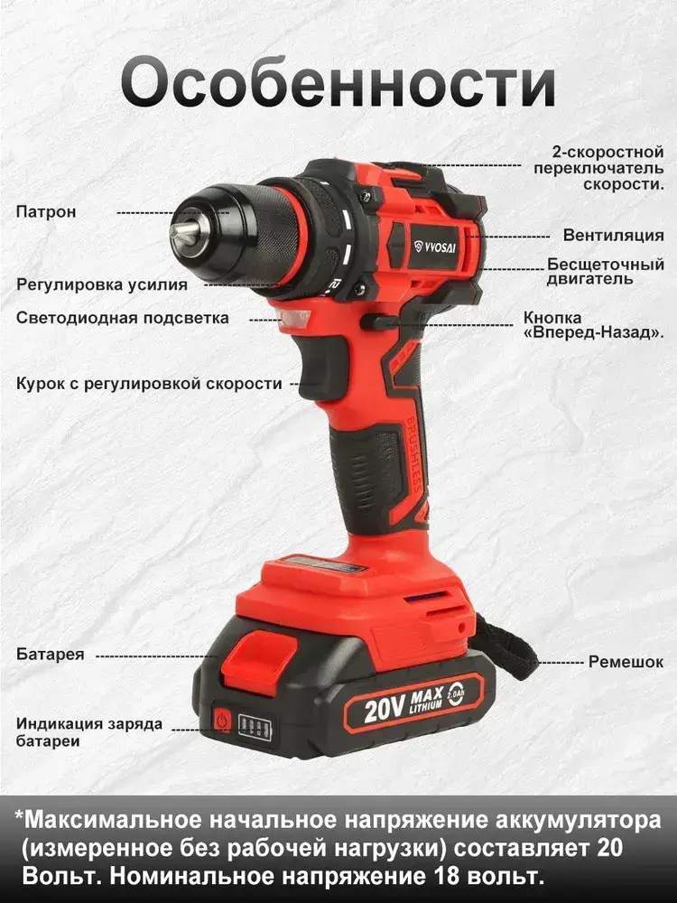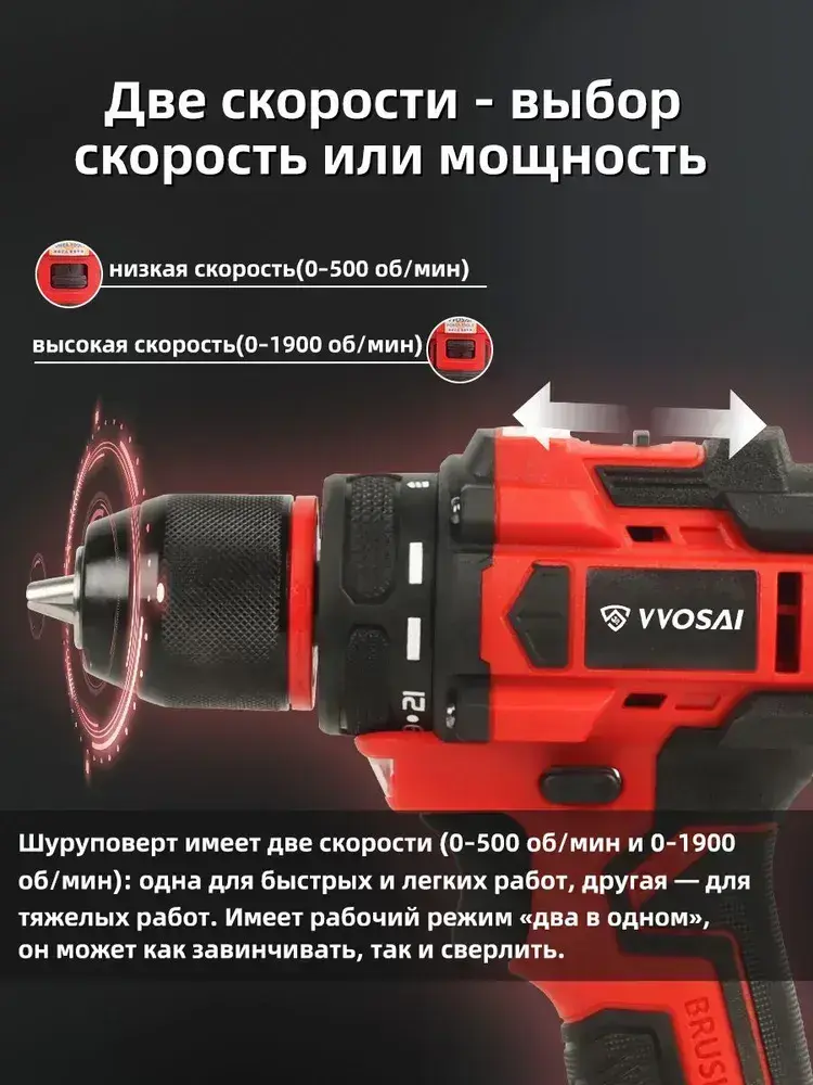 Дрель-шуруповерт аккумуляторная VVOSAI WS-9020-C2-SXP, 20В 50Нм, 2xLi-ion, ЗУ