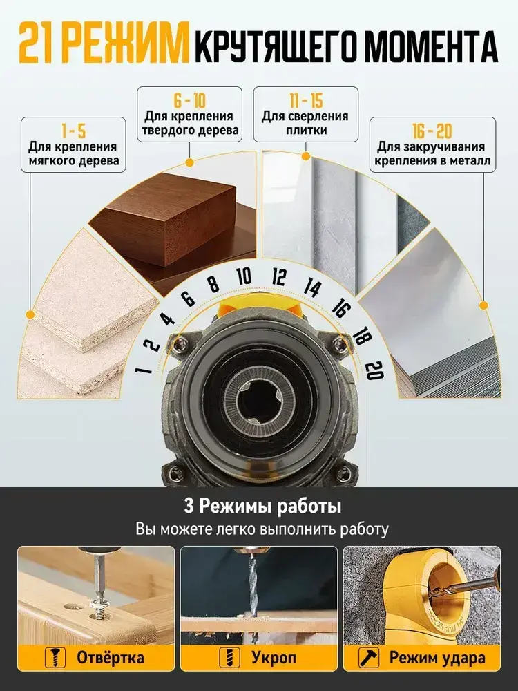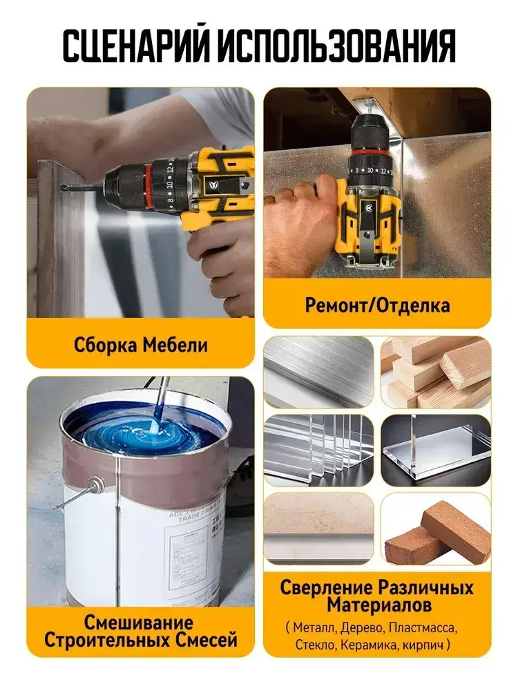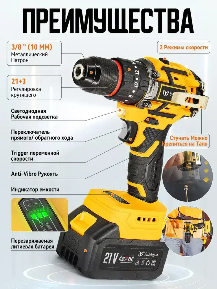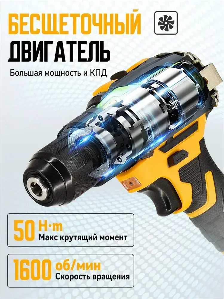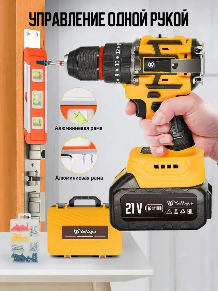 Дрель шуруповерт аккумуляторный бесщеточный 50Нм 2*4Ач 21В, YouVogue,многопрофильный для сверления, затяжки винтов и долбания, Комплект в кейсе