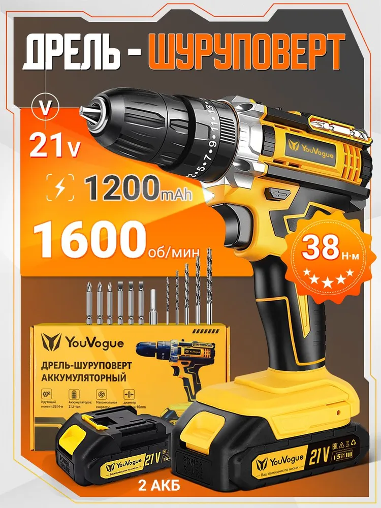Дрель-шуруповерт аккумуляторный,21В,2АКБ,38Нм,ударный,набора