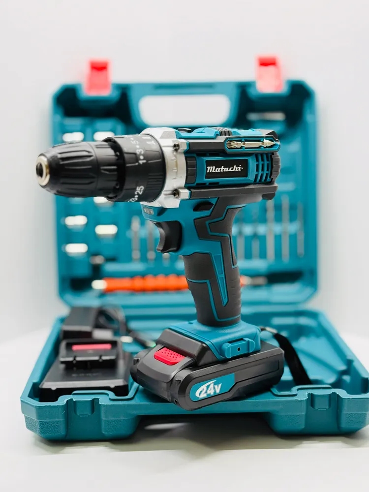 Дрель шуруповерт ударный аккумуляторный, 2 АКБ 24В , 24 насадки и зарядная станция в наборе
