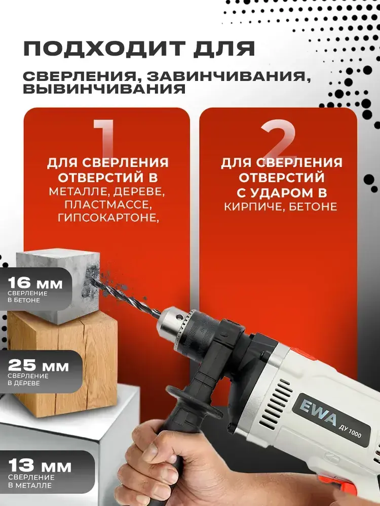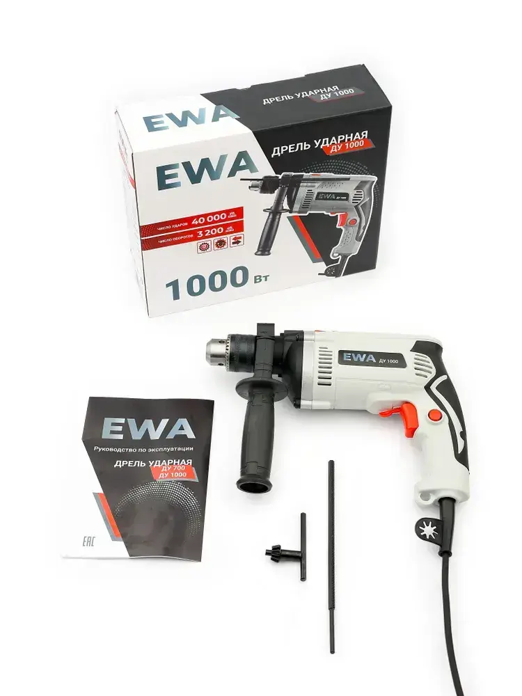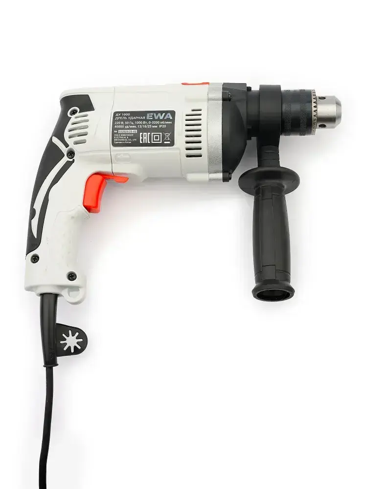 Дрель ударная электрическая , EWA ДУ 1000, 1000 Вт, регулировка оборотов 0-3200 об/мин, 40000 уд/мин, патрон 13 мм