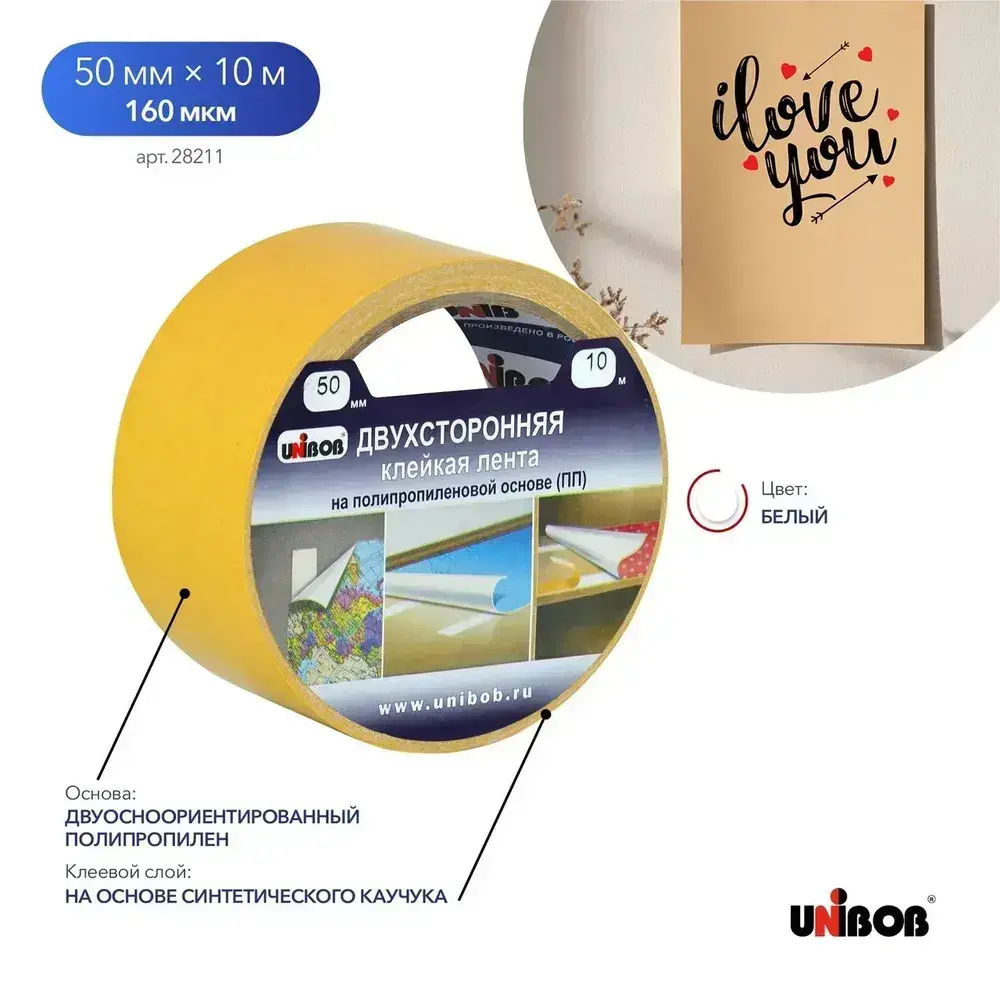 Двухсторонний скотч 50 мм * 10 м 160 мкм, Клейкая лента на основе полипропилена Unibob