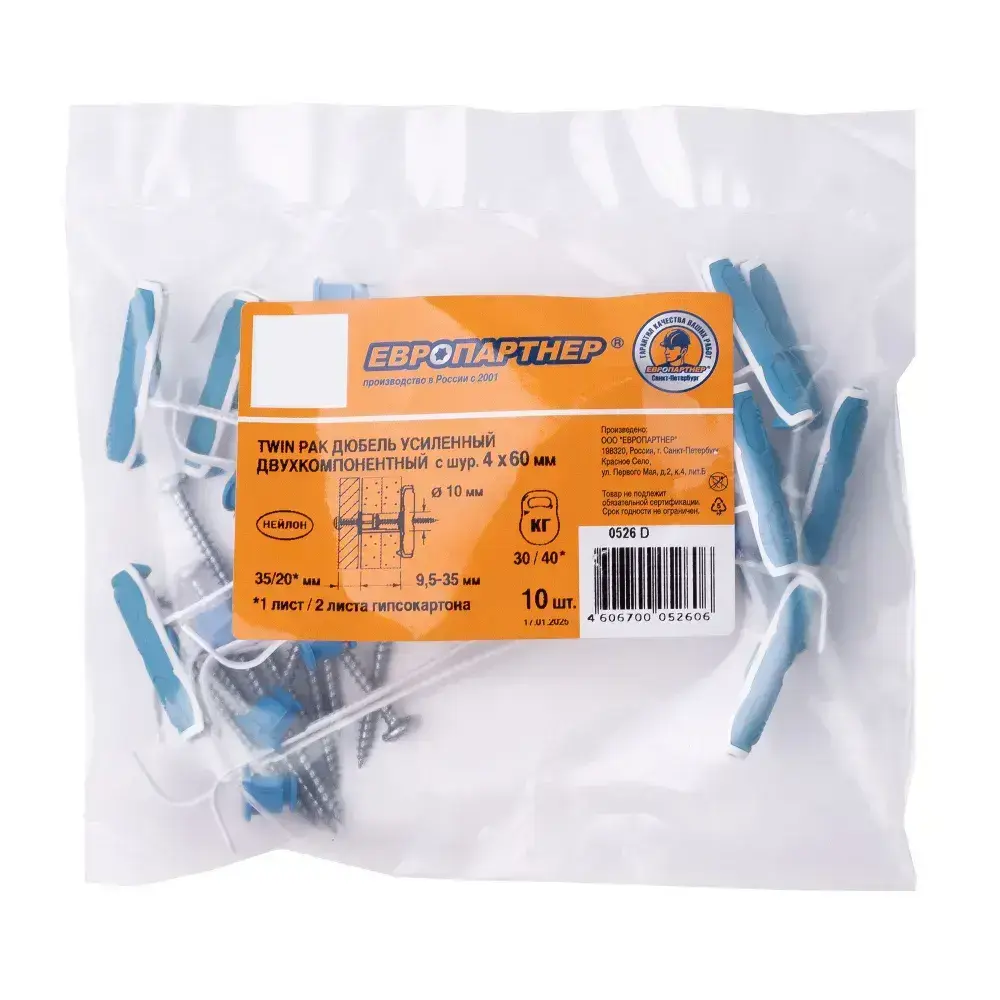 Дюбель для гипсокартона самоустанавливающийся TWIN PAK нейлоновый ЕВРОПАРТНЕР (10 шт.)