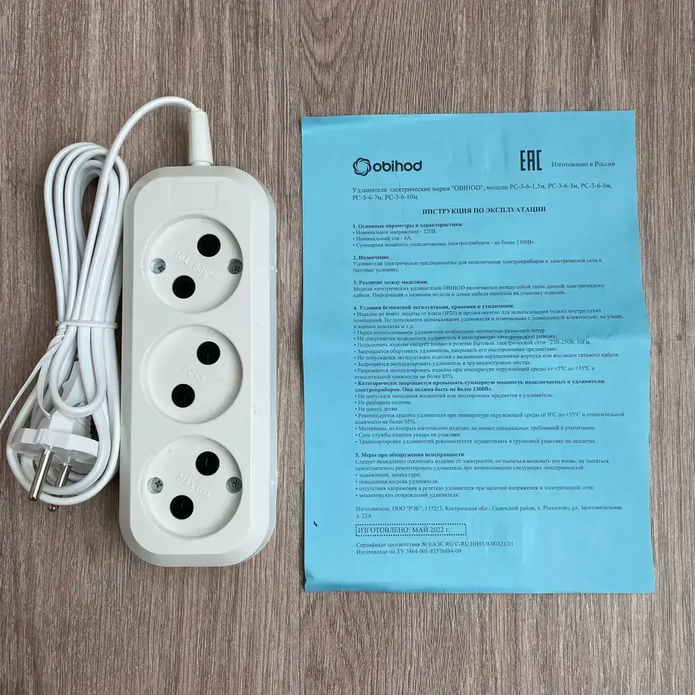 Электрический удлинитель тройник Obihod обиход ШВВП, 3м, белый, 6A