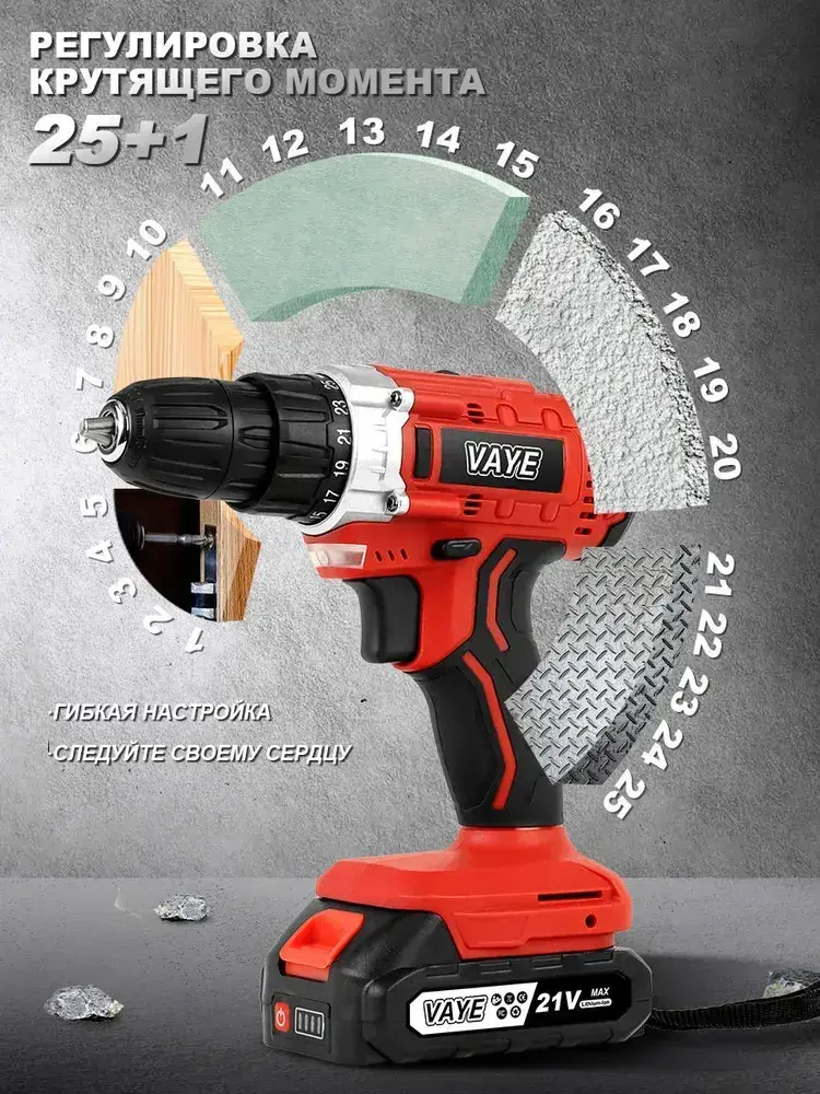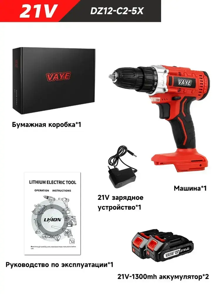 Электродрель VAYE DZ12-C2-5X, аккумуляторная, 20 В, 35 Нм, 2 аккумулятор