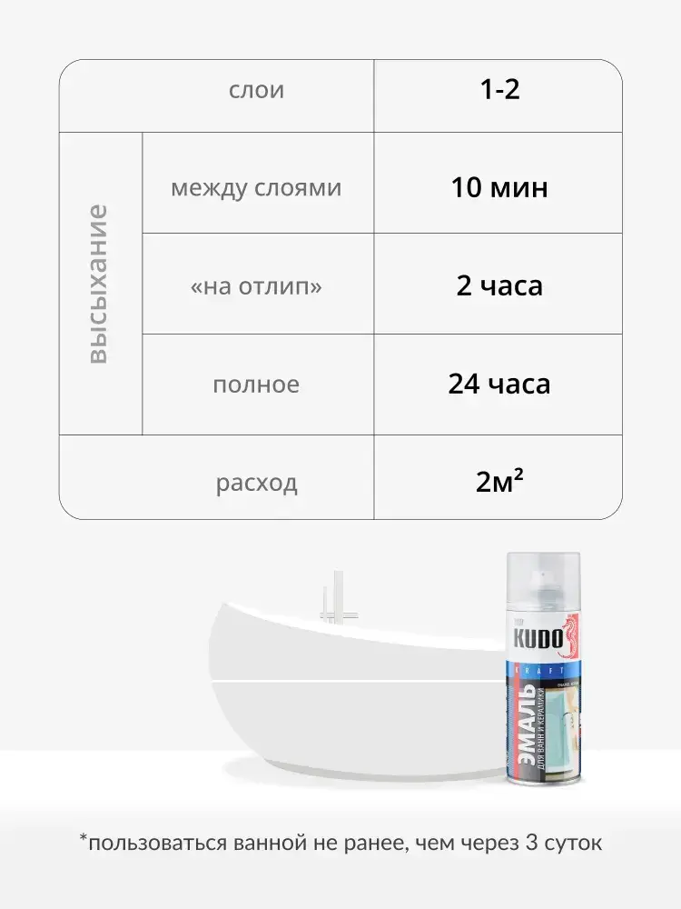Эмаль KUDO "Краска для реставрации ванн и керамики", аэрозольный баллончик, алкидная, 520 мл, белый глянцевый KU-1301