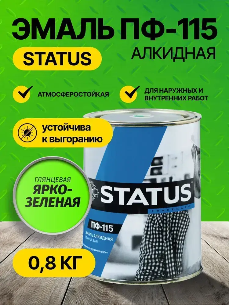 Эмаль ПФ-115 STATUS РАДУГАМАЛЕР ярко-зеленая 0,8 кг , атмосферостойкая, глянцевое покрытие/краска по металлу, дереву, кирпичу и бетону /для наружных и внутренних работ