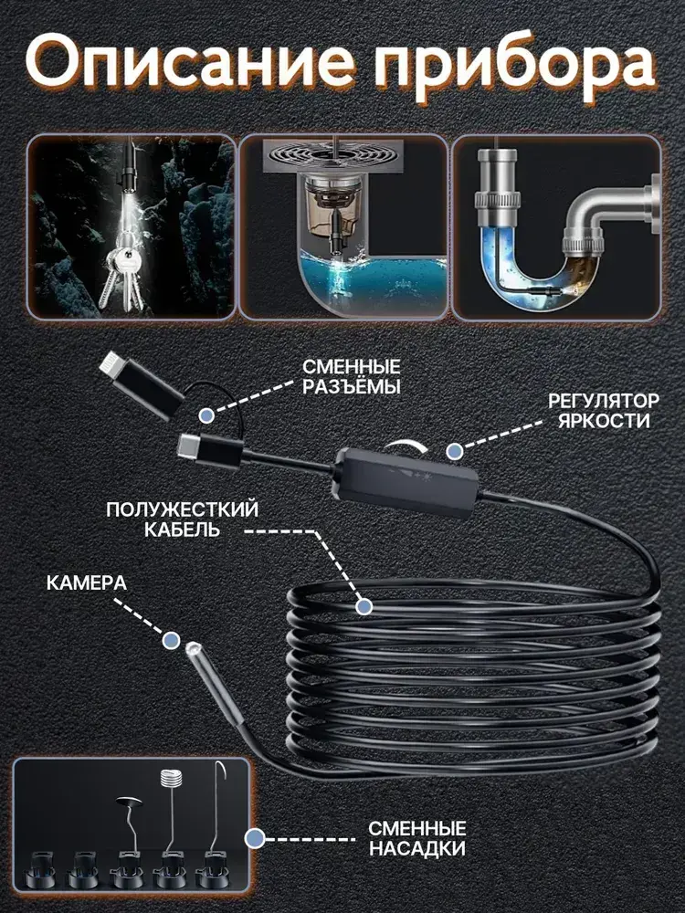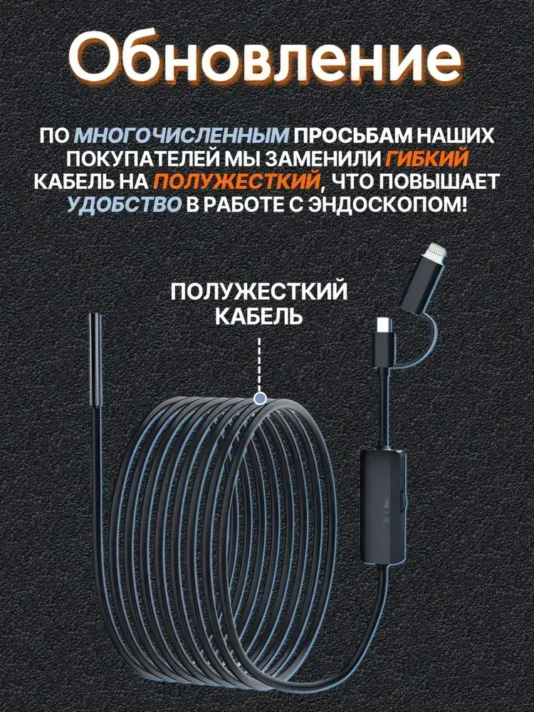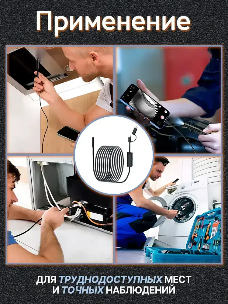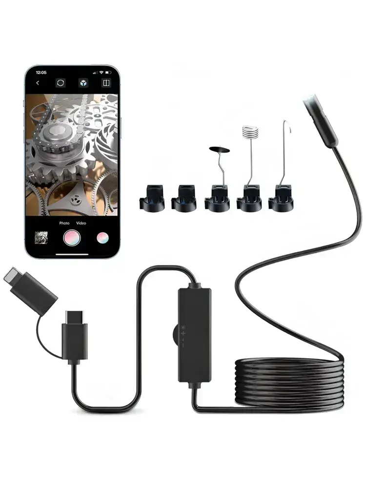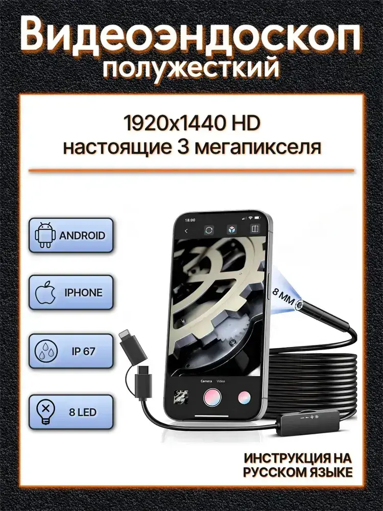 Эндоскоп для смартфона, 3МП, 8мм, водонепроницаемый, с подсветкой, Android/iOS, 2 метра, жесткий