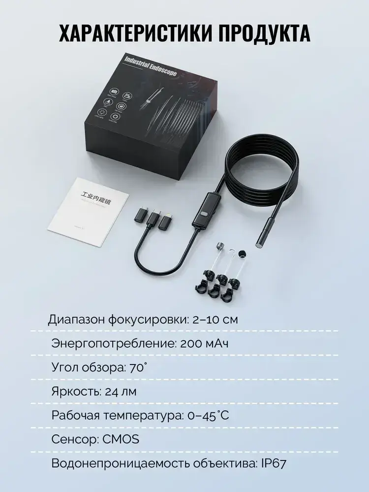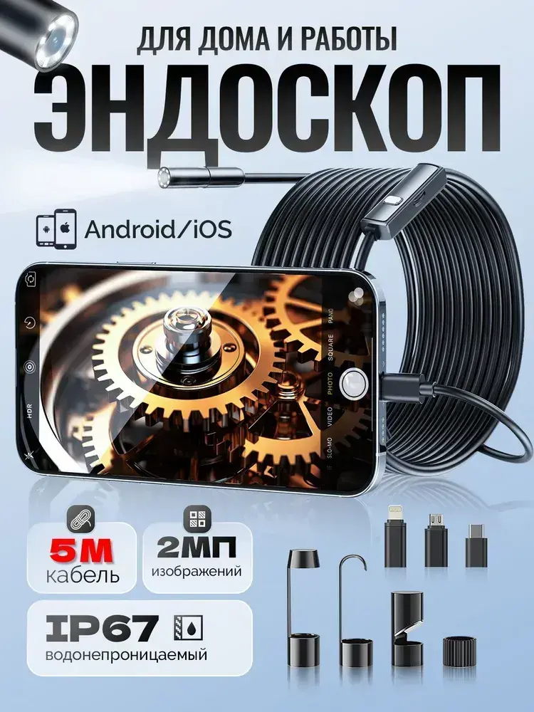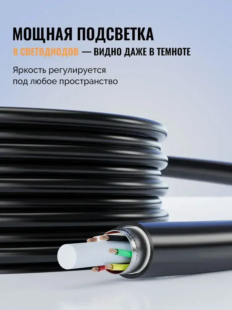 Эндоскоп с камерой и подсветкой,8 мм,1920 HD, 8 регулируемых LED, IP67, полужёсткий кабель 5м, для Android и iOS