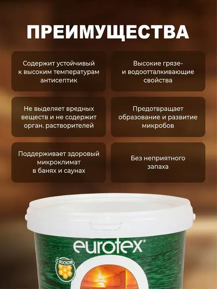 Eurotex Сауна лак для стен в саунах акриловый, бесцветный (0.9 л)