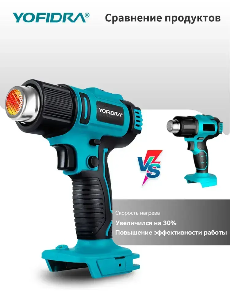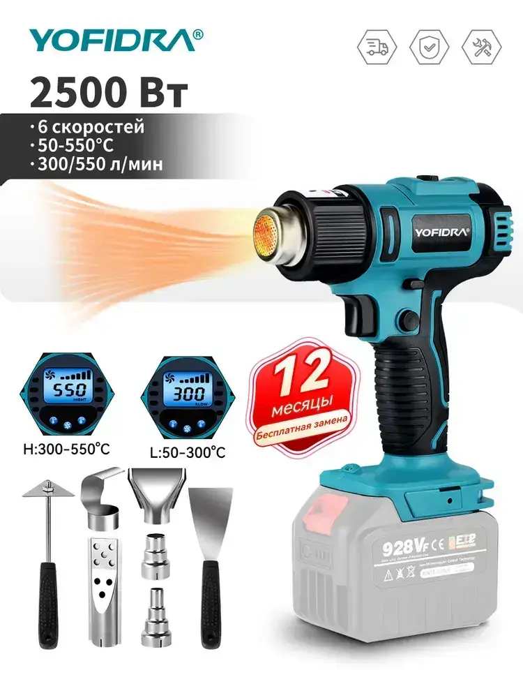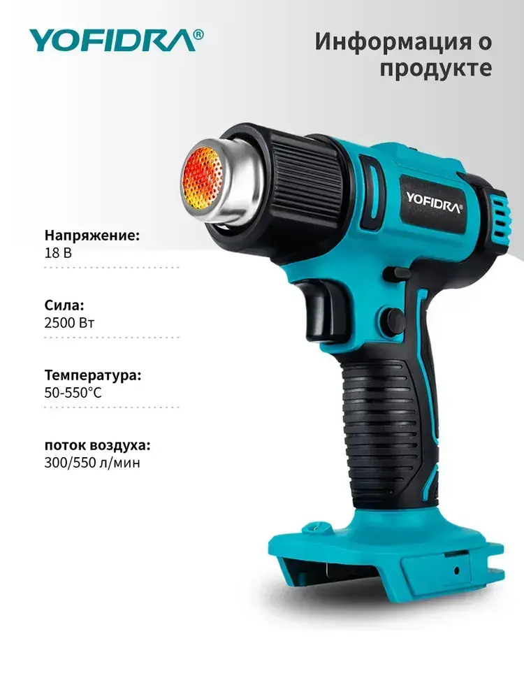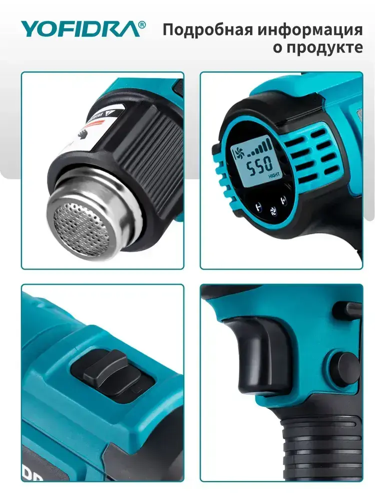 Фен строительный с регулировкой температуры YOFIDRA/ термофен технический, с цифровым дисплеем, без батареи (2 режима, 2500 Вт,300-550 л/мин, 300-550 градусов, 7 сопла)
