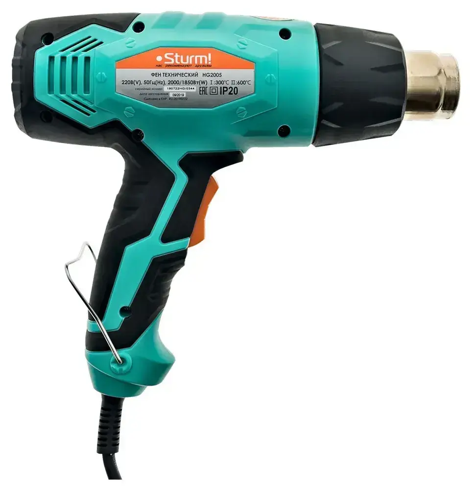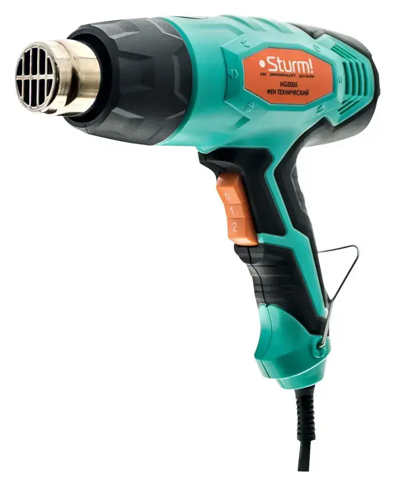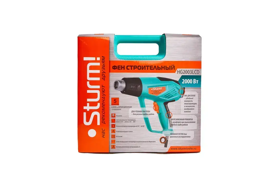 Фен строительный технический, 2000Вт, 300/600C, 250/550л/мин, 5 насадок, Sturm!